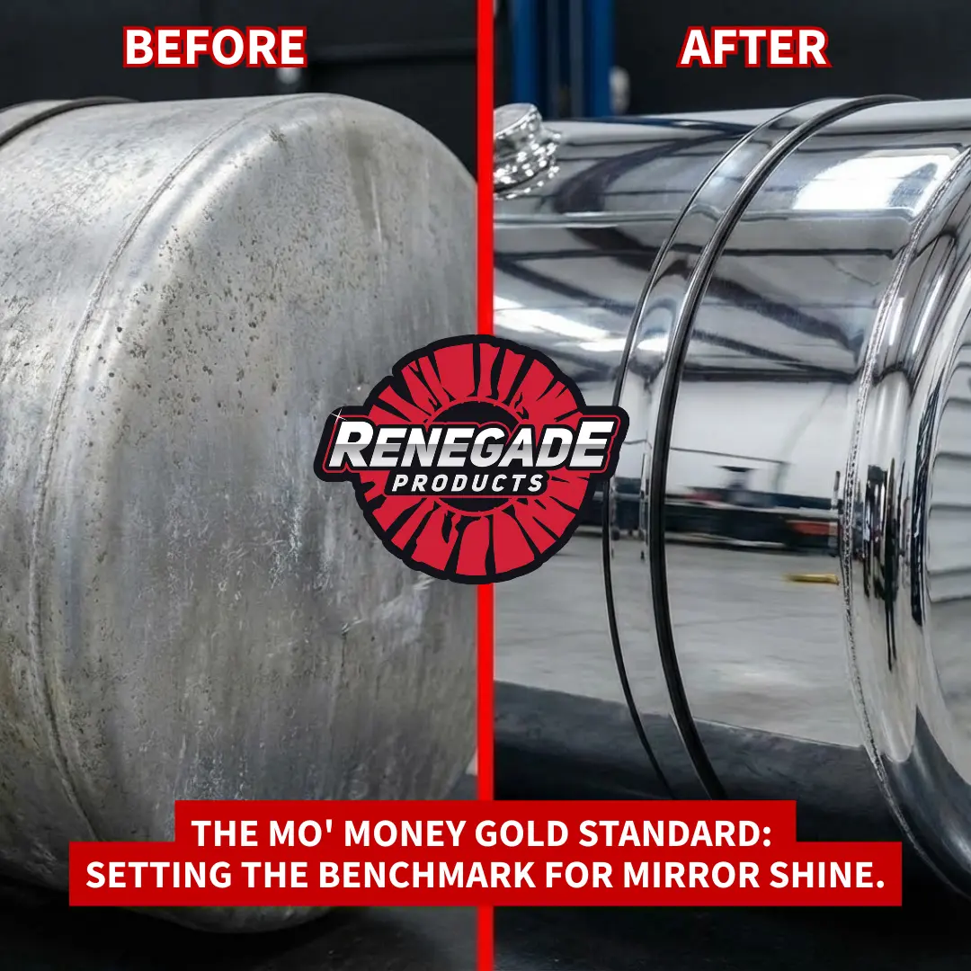 Bring out a high-clarity mirror shine on aluminum and stainless steel with the Renegade Products Mo' Money Gold Standard Bundle — the ultimate two-step polishing system built for detailers, truckers, metal fabricators, and restoration pros.