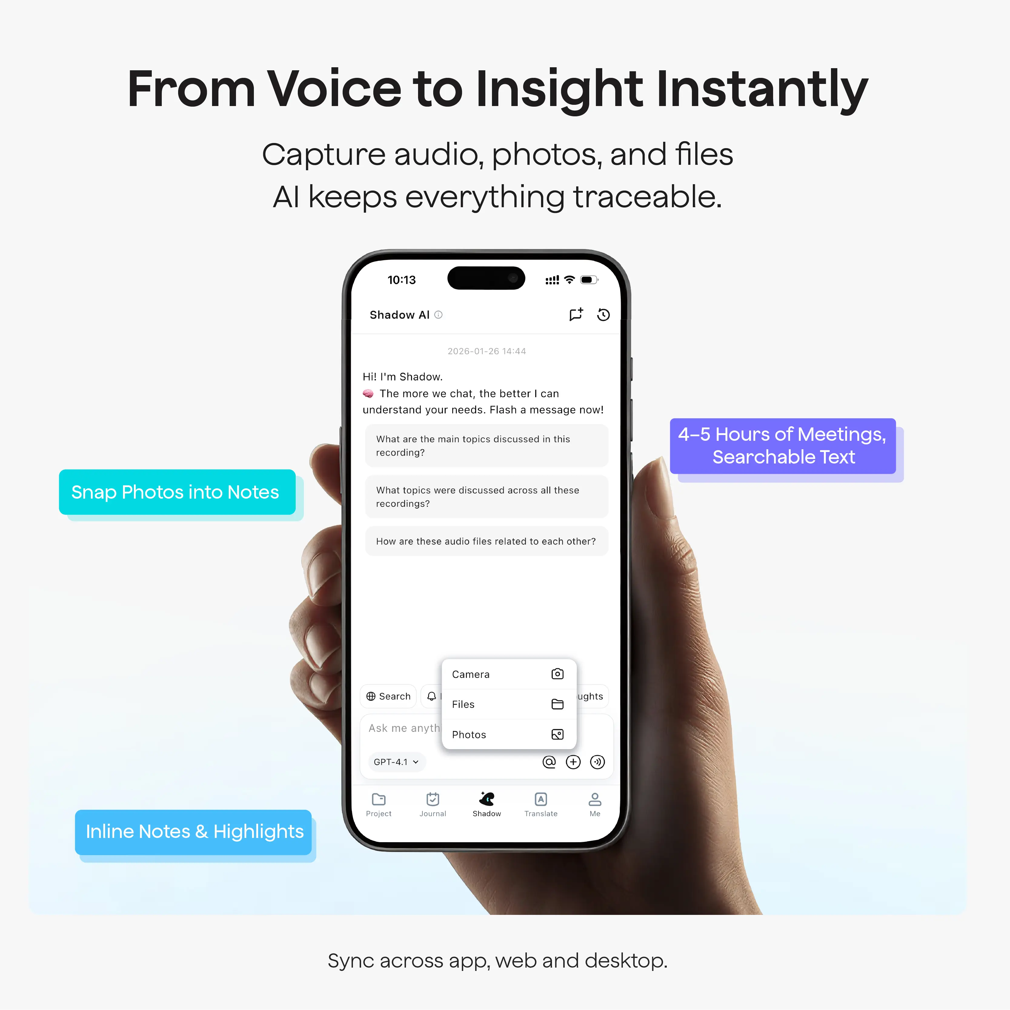 Smart Project Base Organize recordings by project. Build a structured knowledge base that grows with your work.