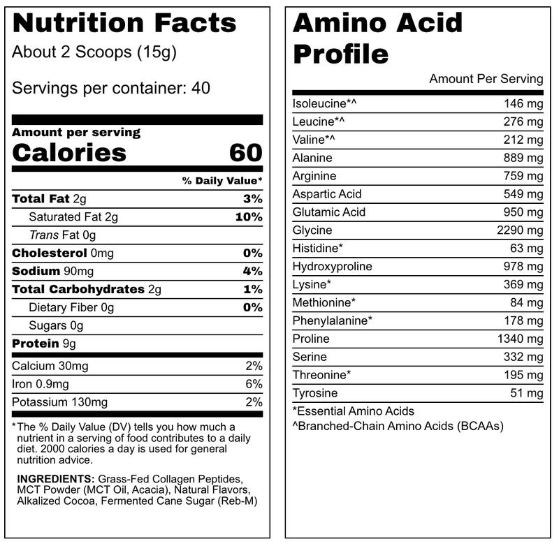 IngredientsGrass-Fed Collagen Peptides,MCT Powder (MCT Oil,Acacia),Natural Flavors,Alkalized Cocoa,Fermented Cane Sugar (Reb-M)