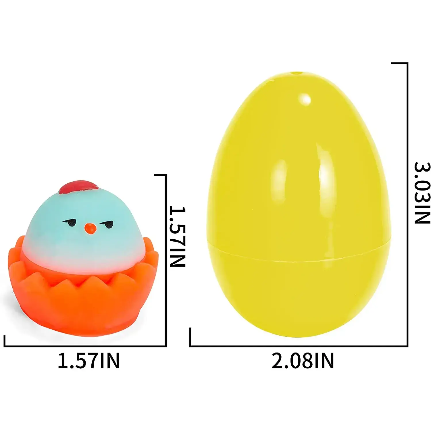 ·SUPER VALUE COMPREHENSIVE SET: This Easter party favors set comes with 12 adorable chicken mochi squishy toys and 12 colorful Easter eggs featuring 6 designs. Each Easter egg is pre-filled with a chicken mochi. The eggs measure approximately 3.03 inches in height, while the squishy toys are sized at 1.57x1.57 inches.