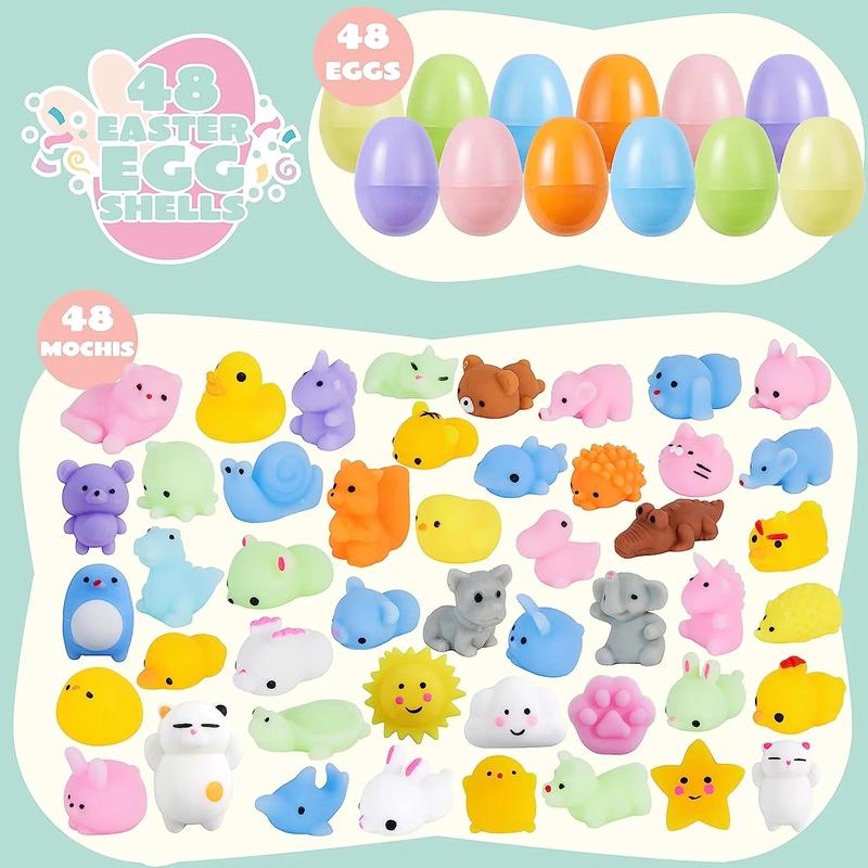 ·SUPER VALUE PACK. Our set of mochi squishy toys includes 24/48 prefilled Easter eggs, each measuring 2.36 inches. These delightful squishy toys are sure to be adored by children and provide days of enjoyment! The assortment features 24/48 mochi squishy toy animals in various shapes, including rabbits, cat claws, smile stars, smile clouds, smile suns, pandas, koalas, sharks, pigs, foxes, unicorns, bears, elephants, ducks, and more. All neatly packaged in exquisite gift boxes.