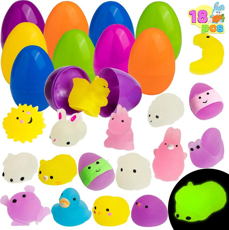 ·SUPER VALUE. This set of 18 prefilled plastic Easter eggs is a fantastic deal, featuring adorable animal Mochi Squishes that glow in the dark and sparkle. These Kawaii Foamy Stress Reliever squishy toys come pre-filled in themed Easter eggs, each measuring 3.15 inches.