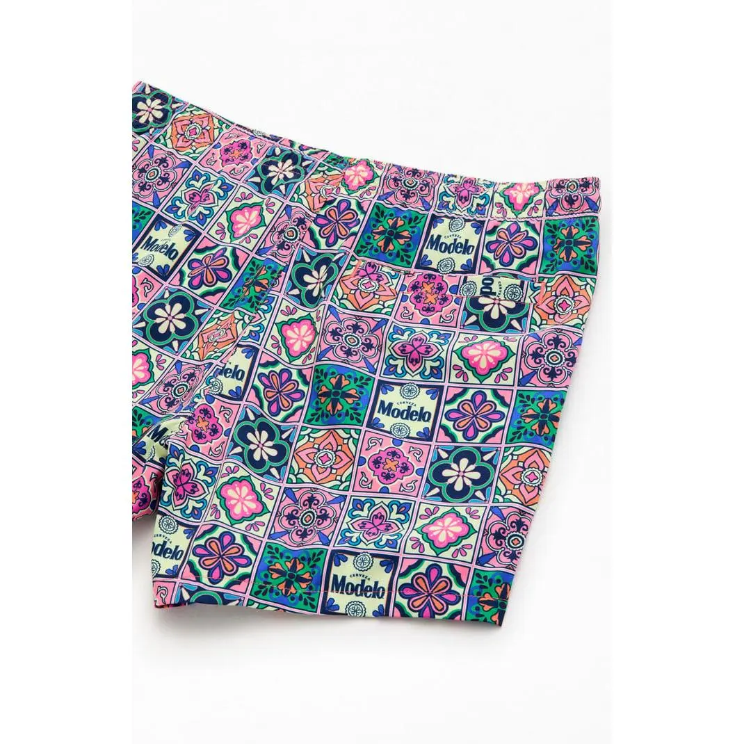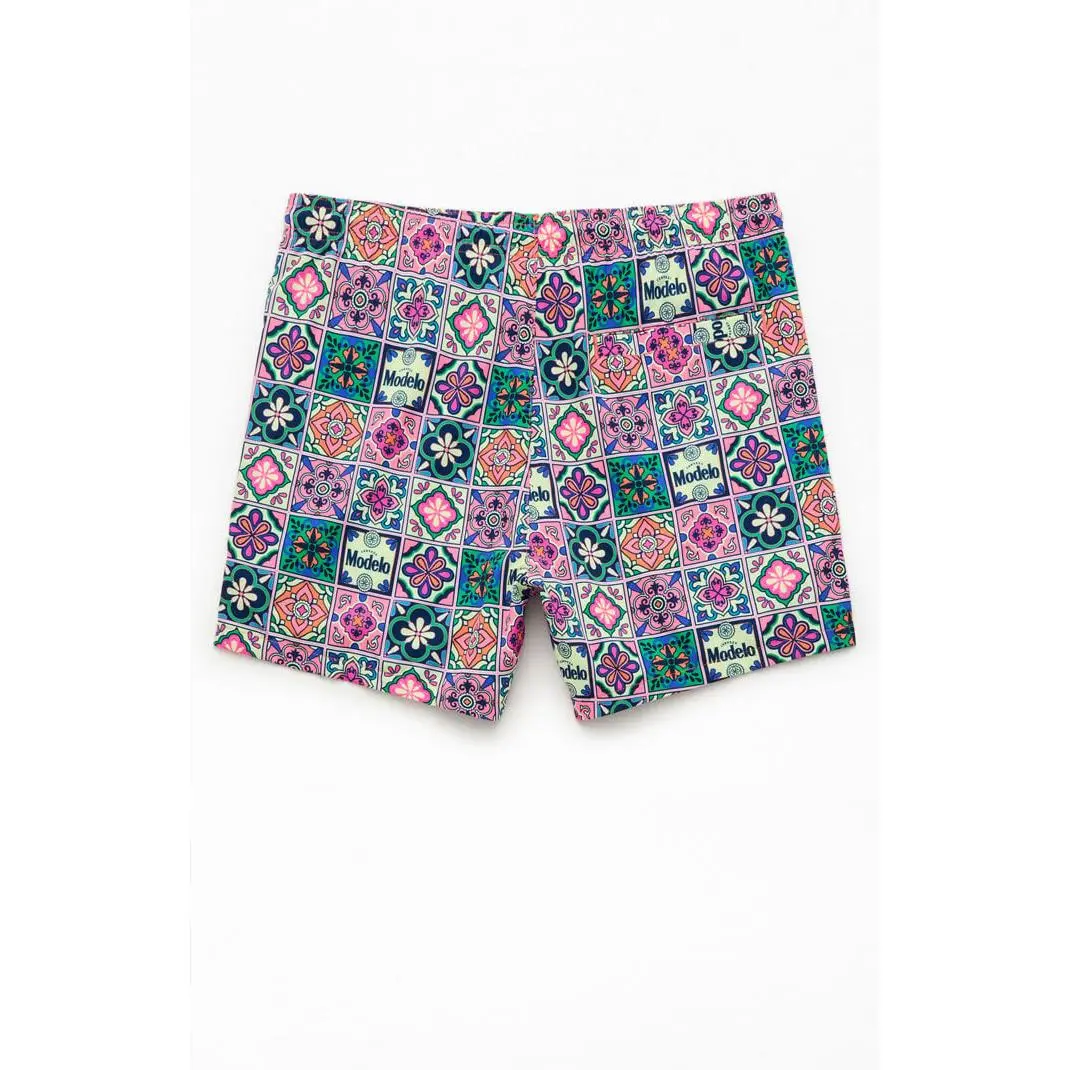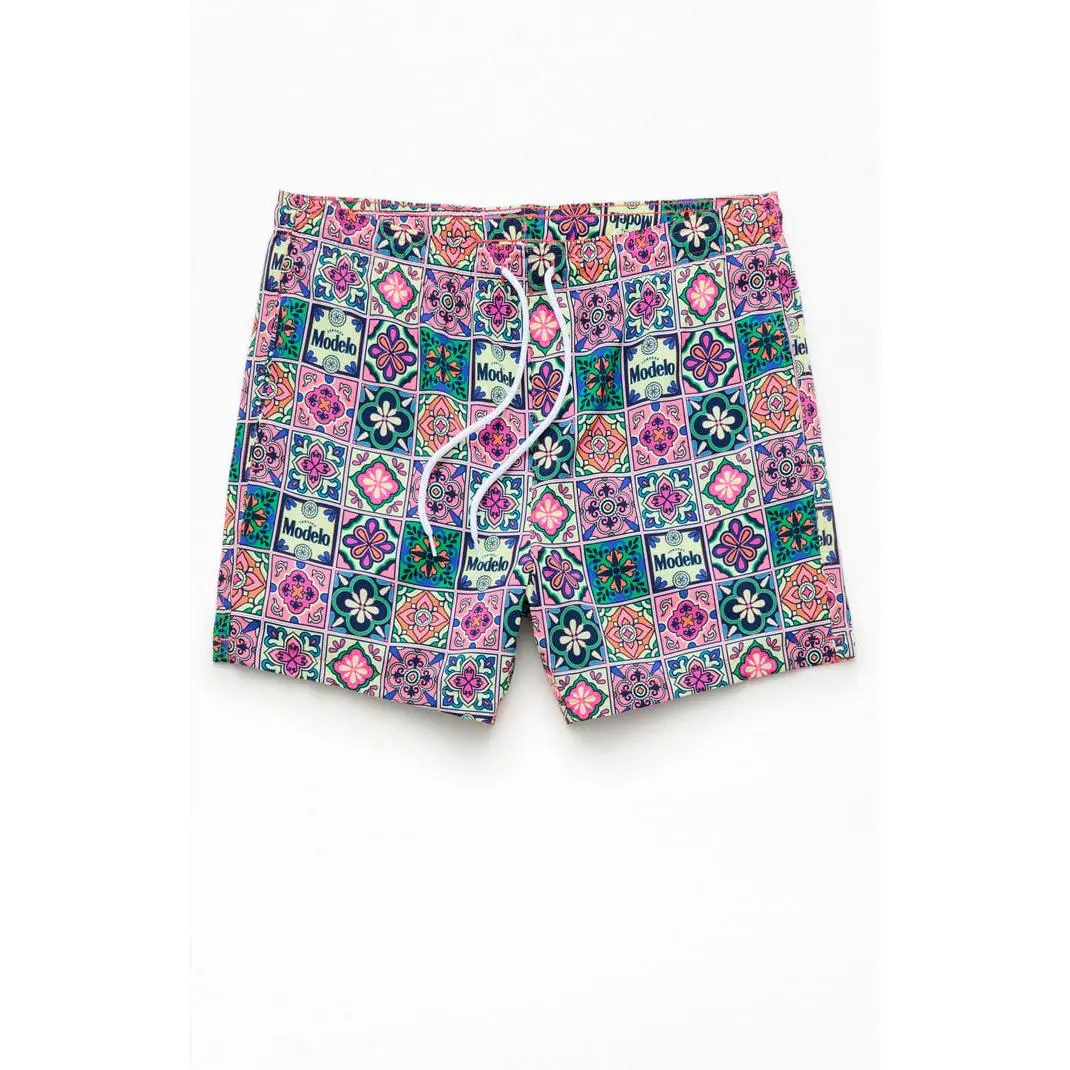 Make it a summer of fun with the Modelo Tile 5" Swim Trunks. These swim trunks feature an elastic stretch waistline, side pockets, a mesh lining, and a Modelo tile pattern throughout.