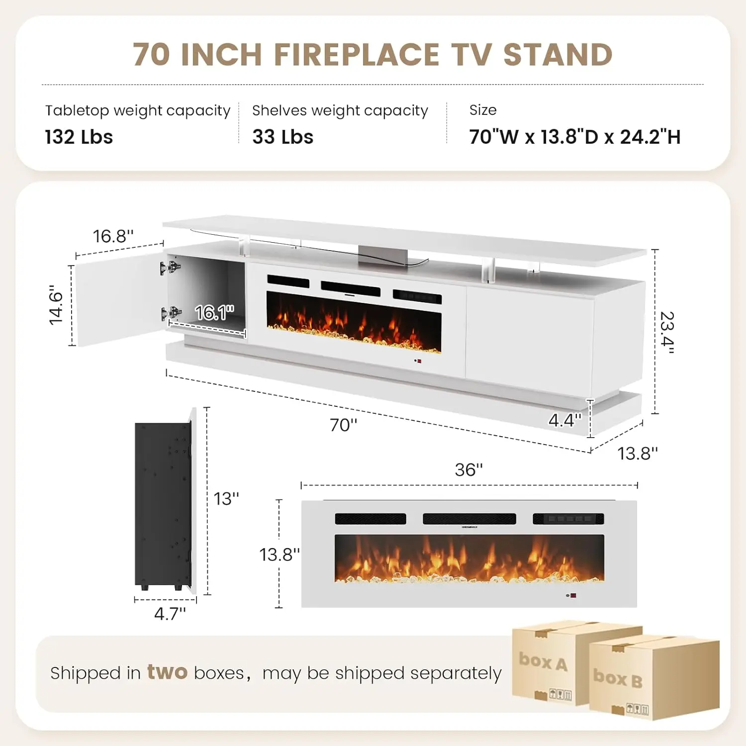 A sleek all-in-one entertainment center for TVs up to 80"! It blends a realistic cozy fireplace, ample storage, and customizable RGB lighting with uncompromising safety and modern design—elevating your living room style and functionality in one piece.