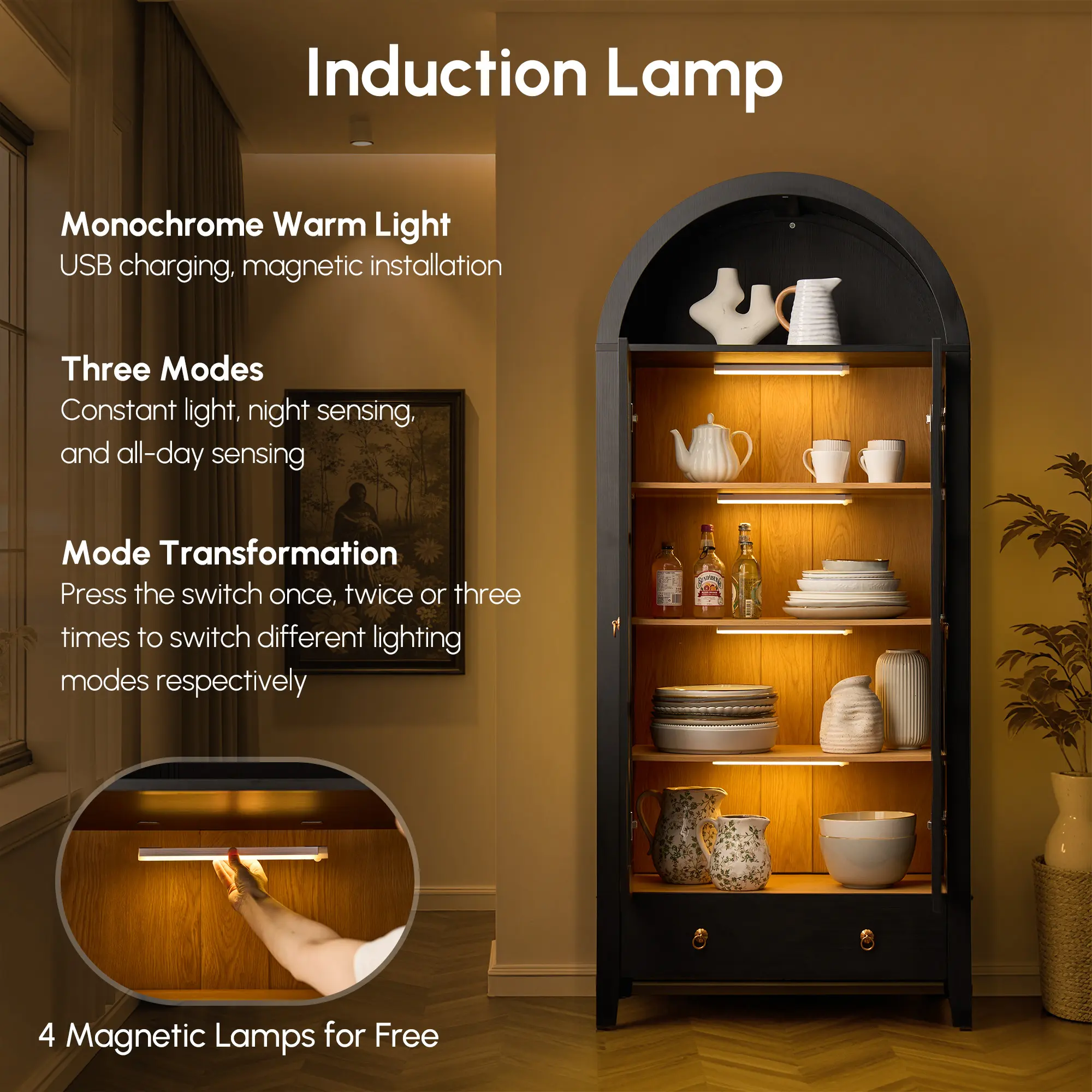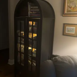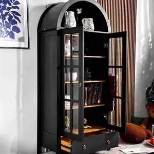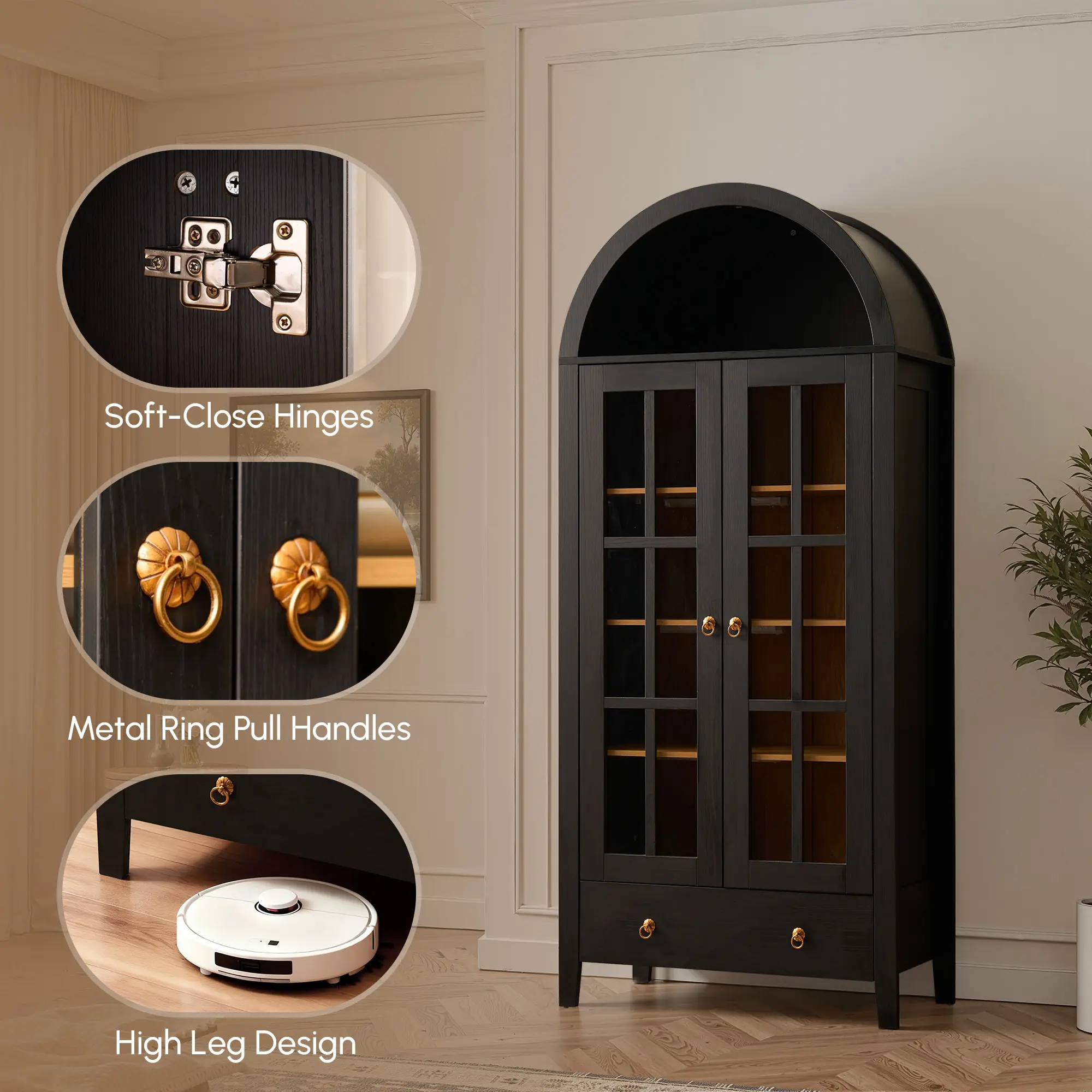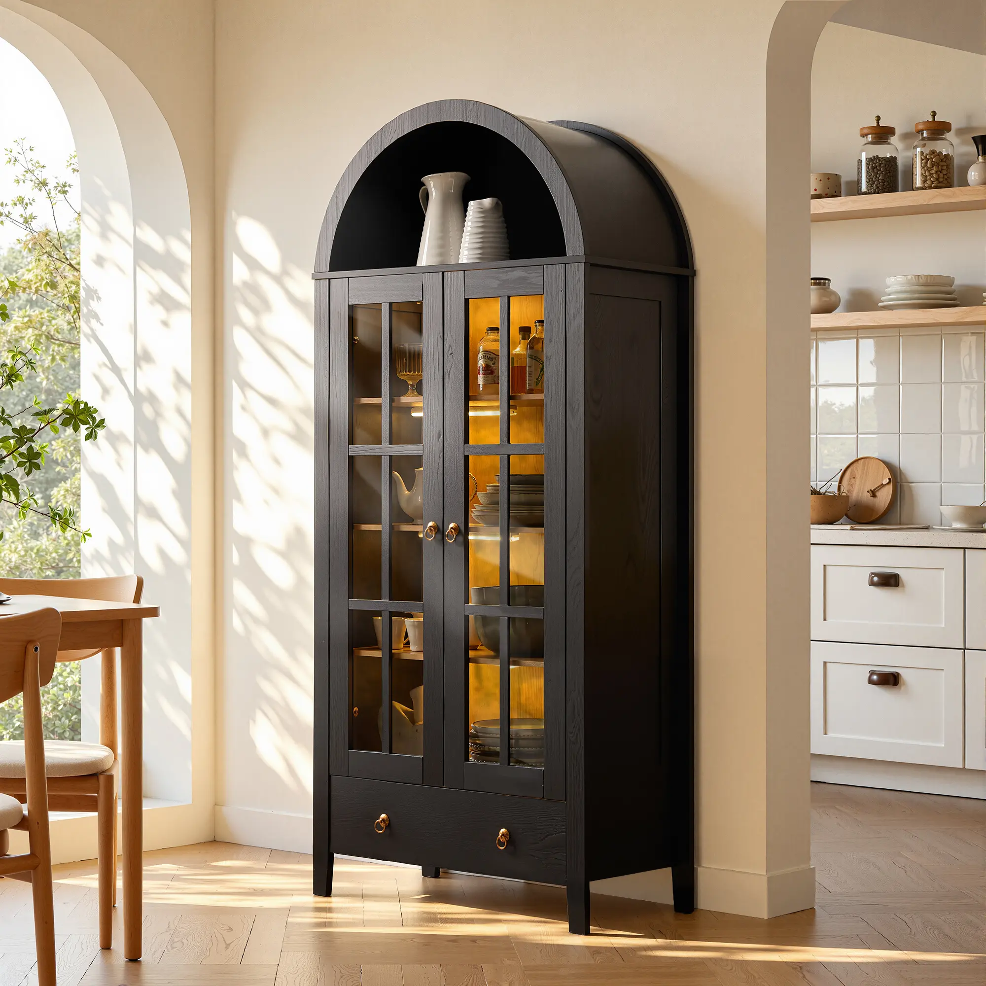 ·BEAUTIFUL LED LIGHTS : Brighten up your space with the 4 Magnetic LED lights that wrap Inside the arched glass cabinet. You can set the mood for cozy reading or intimate conversations.