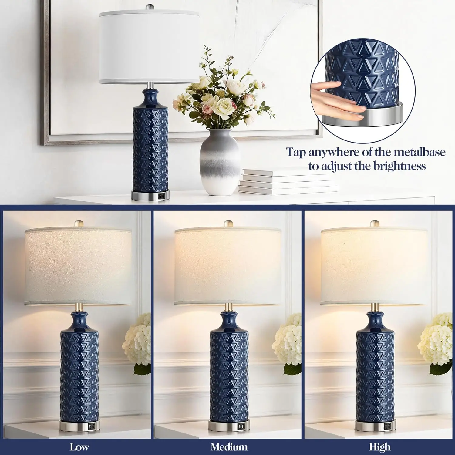 ·3-way dimmable touch control: the bedside lamp offers 3 level brightness options (Low, Medium, High) to meet your different needs. Just tap anywhere of the metal base to adjust the brightness (Please note: Base touch only). Nightlight for a good sleep or nursing. Accent lighting for warm mood. Proper high comfortable brightness for studying or working. It’s very handy to operate.