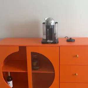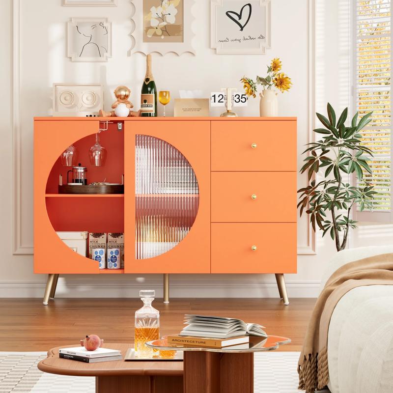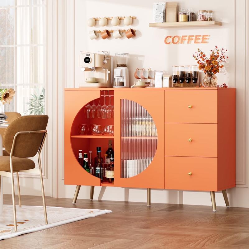 Stylish & Functional Coffee Bar – Features a soft orange finish with a unique arched door and glass panel for a modern look.