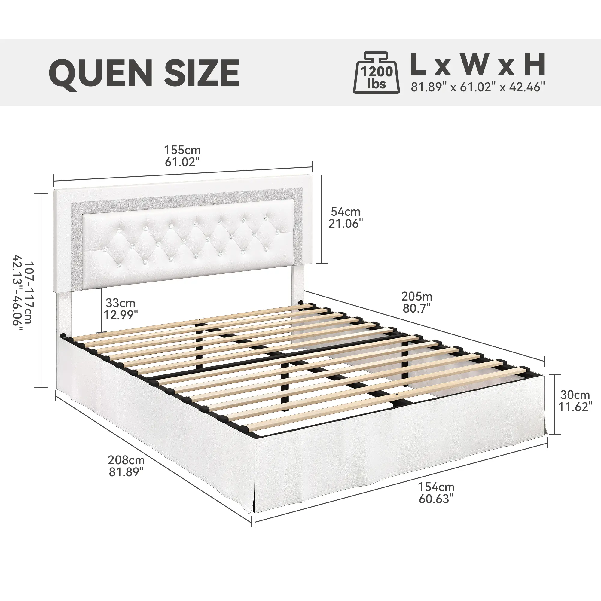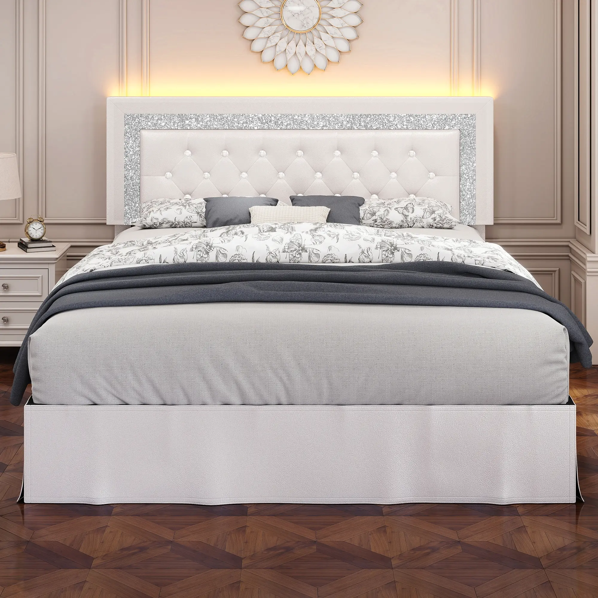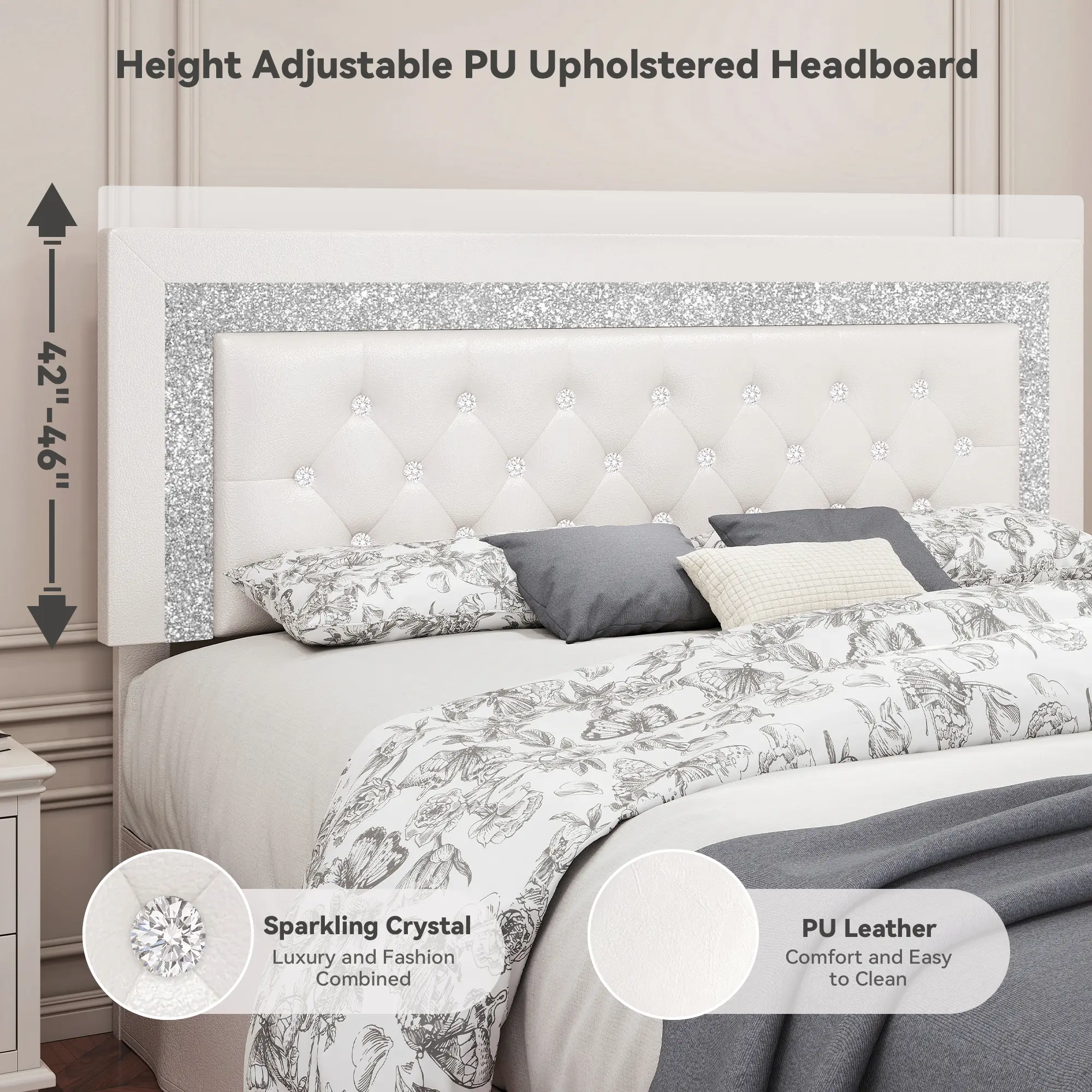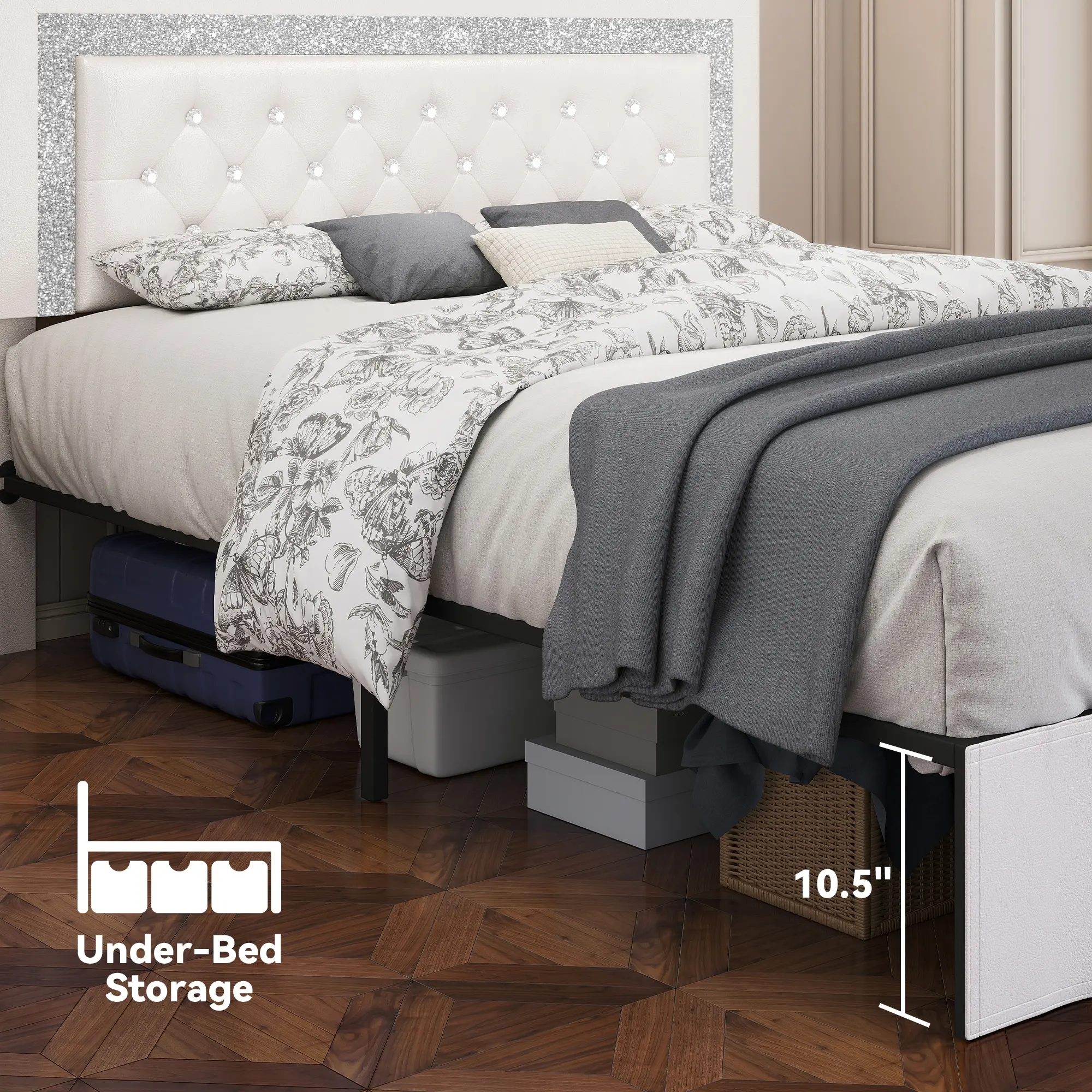 The elegant diamond-tufted headboard creates a stylish, modern centerpiece for your bedroom. Soft linen upholstery and crystal button details elevate the aesthetic, giving your space a clean and luxurious vibe.