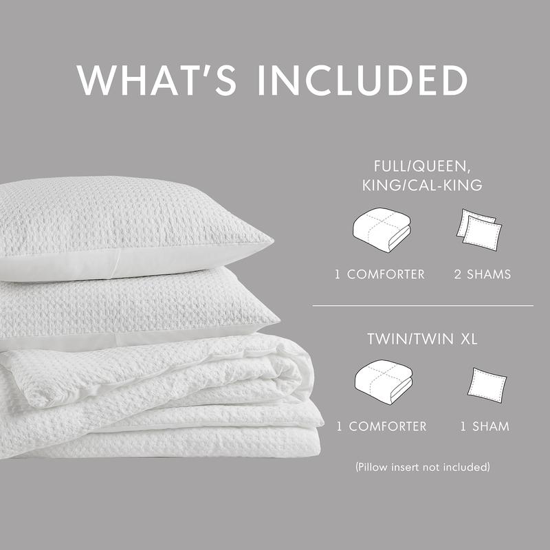 The set features a solid color classic dotted weave for visual appeal and texture. It includes 1 comforter and 2 matching shams, ensuring a cohesive look. Available in Twin/Twin XL, Full/Queen, and King/Cal King sizes. Colors include Light Grey, Neutral, Sage Green, and White. Each size comes with specific dimensions for comforter and shams.