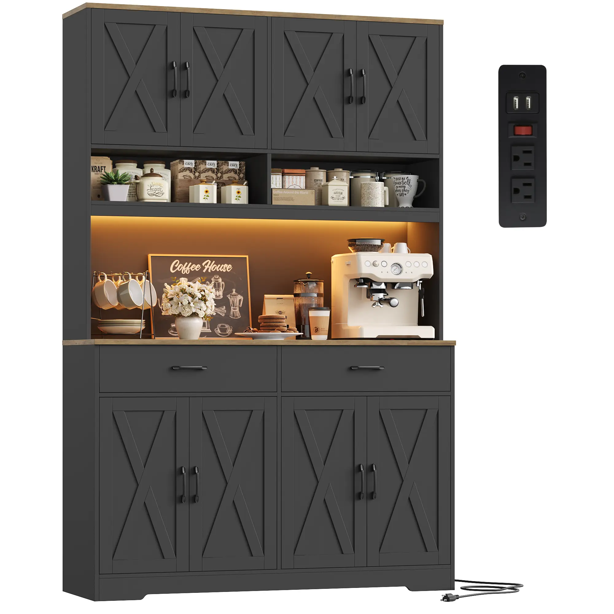 🌟 Maximize organization with 4 adjustable cabinets, 2 deep drawers, and open display shelves. The generous, dedicated food pantry cabinet comfortably fits multiple appliances simultaneously. The vertical design ensures all kitchen essentials are neatly stored and easily accessible.