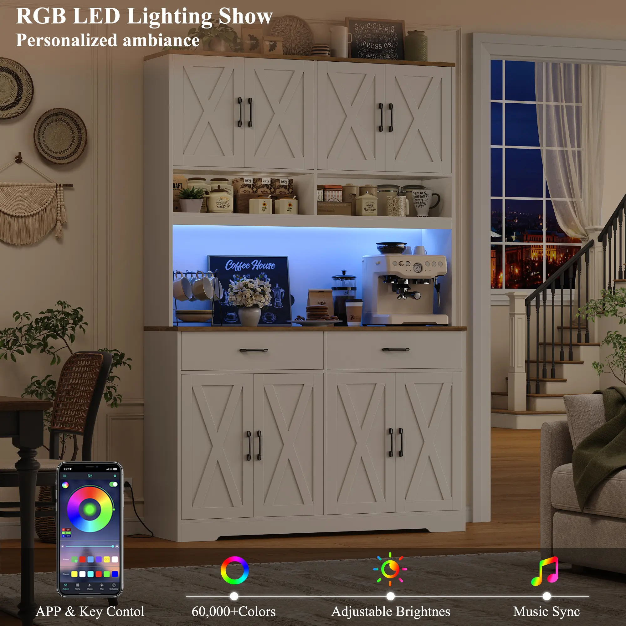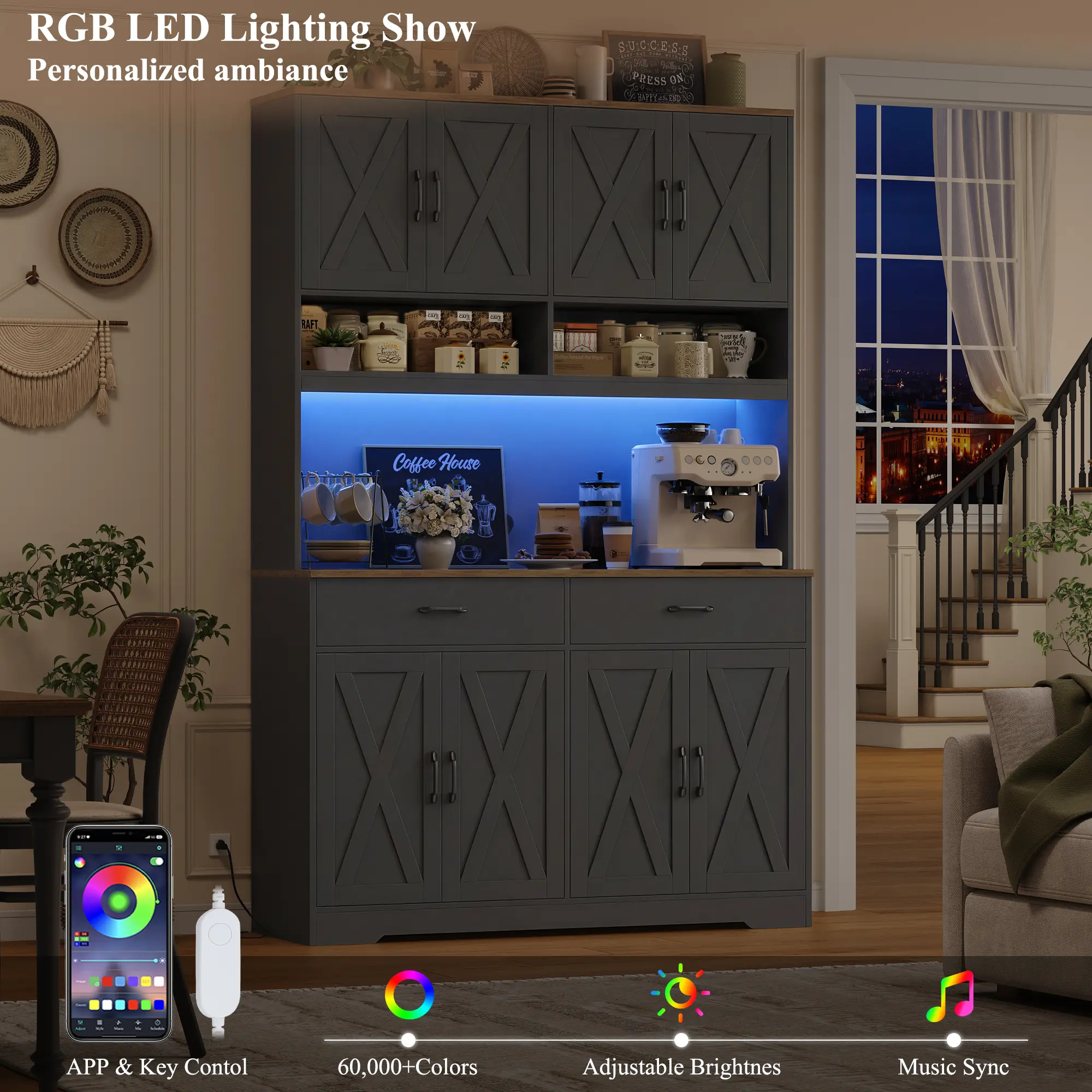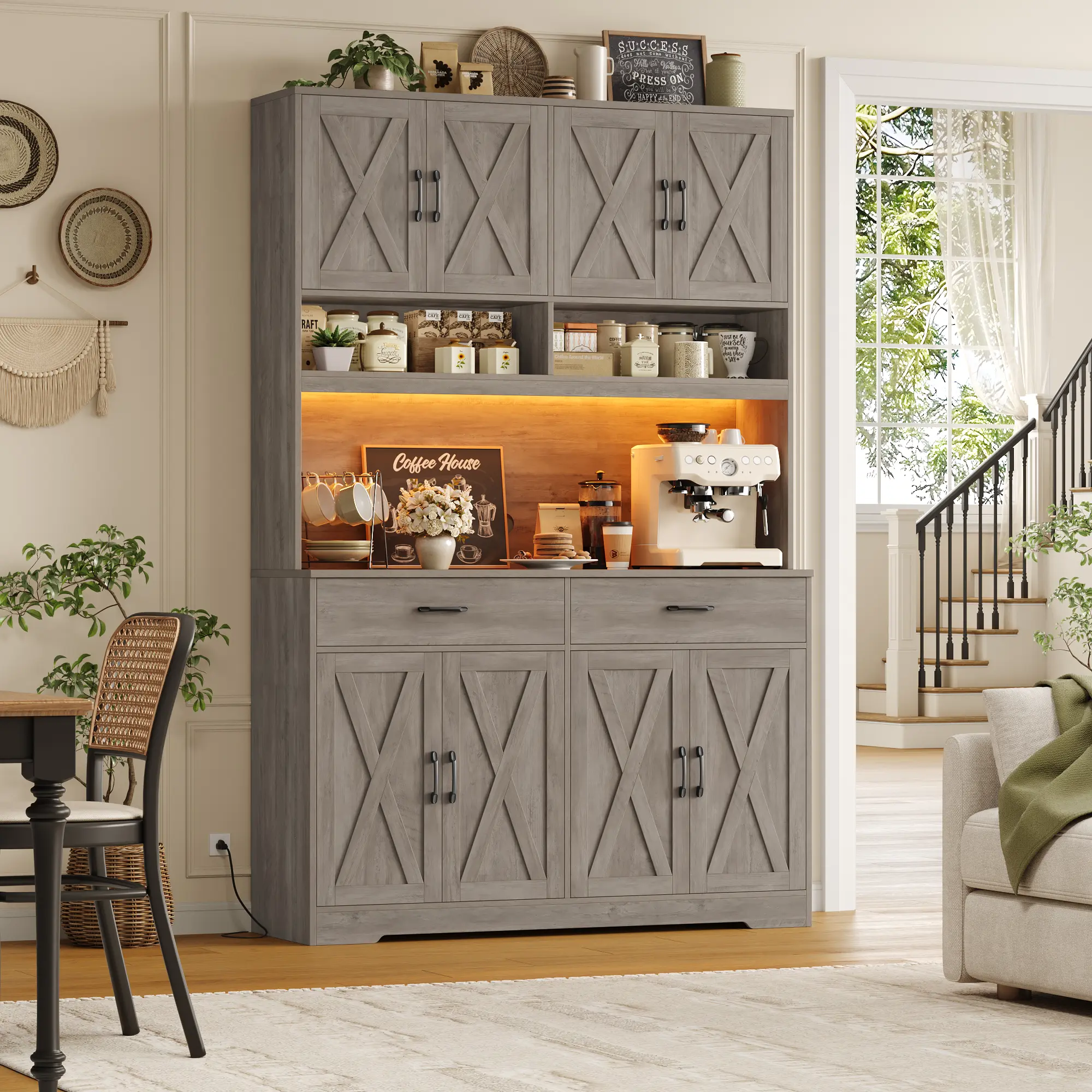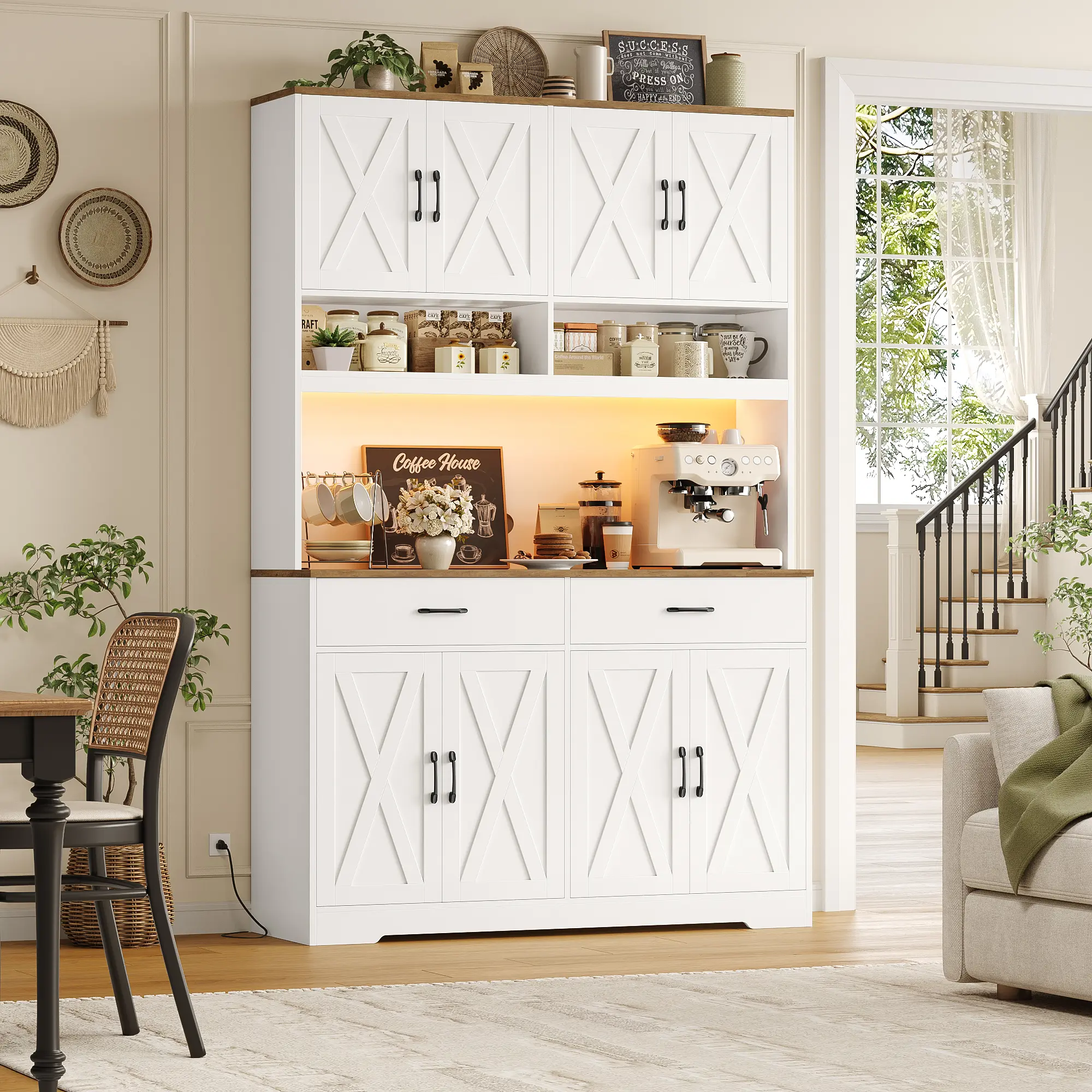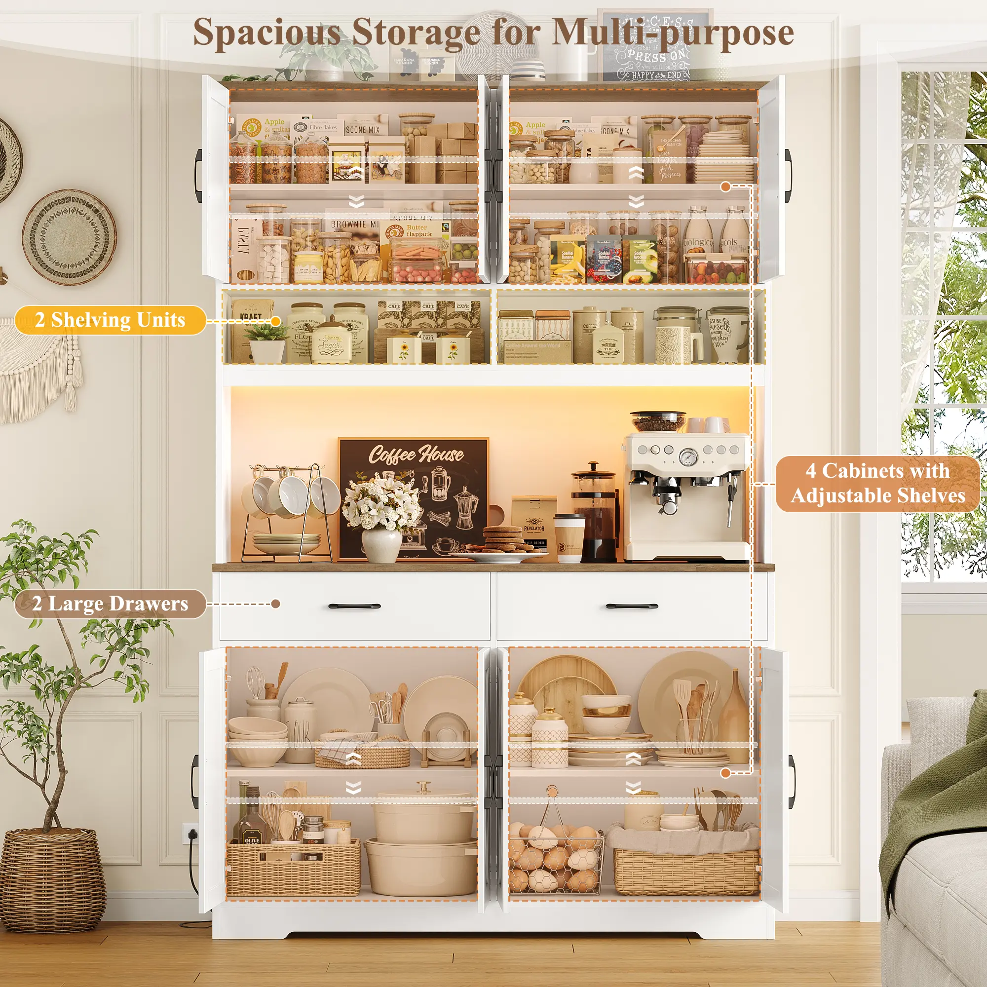 🌟 Beyond its stunning appearance, this pantry offers exceptional multi-purpose functionality. It transitions seamlessly into a stylish kitchen storage cabinet, a convenient living room coffee bar, or a dining room buffet hutch. It expands usable space while enhancing storage capacity and style.