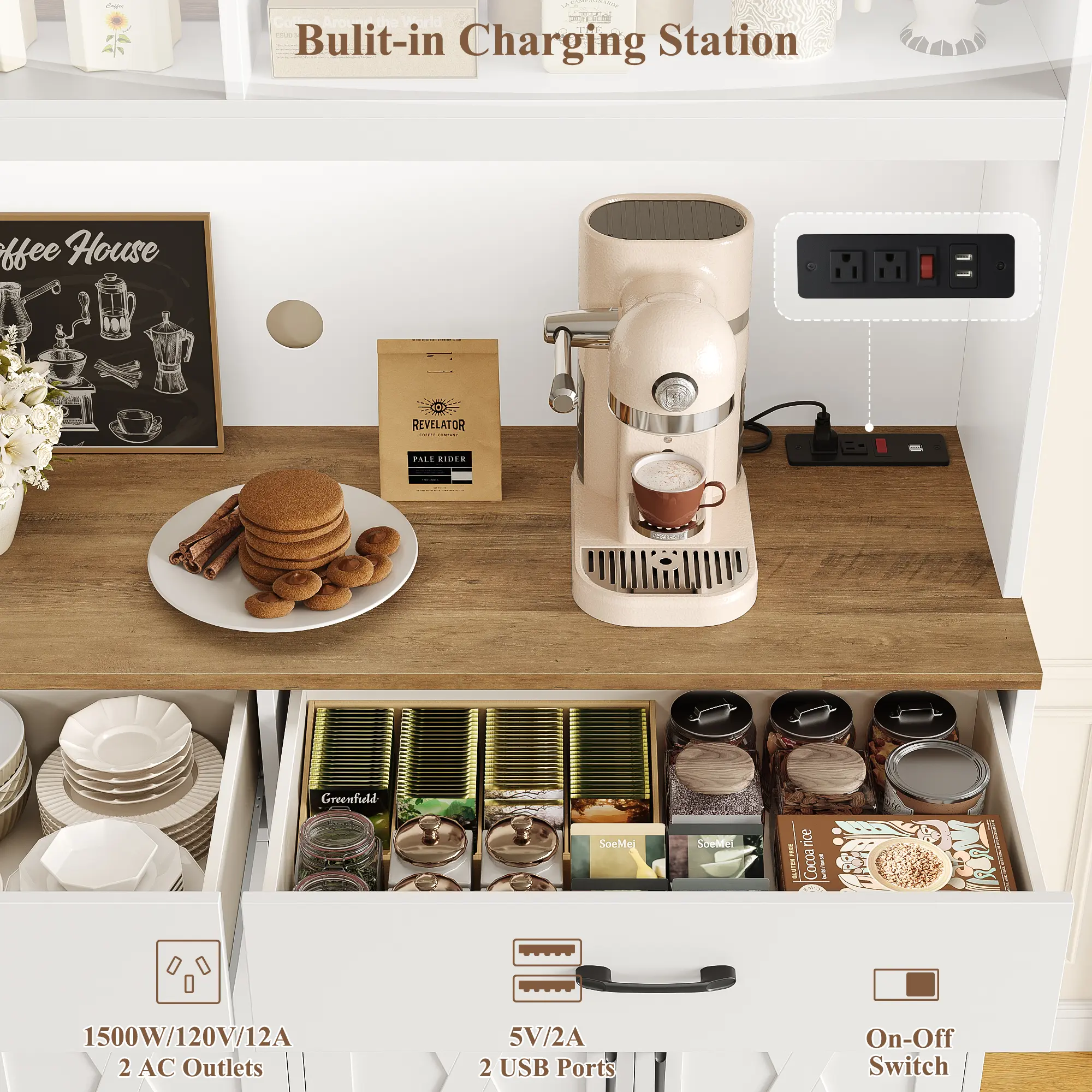 🔌 Maintain a clutter-free countertop with the integrated power station, featuring 2 AC outlets and 2 USB ports. Cable management holes ensure tidy cord storage, while built-in overload protection and a 1500W max rating ensure safe and convenient operation.