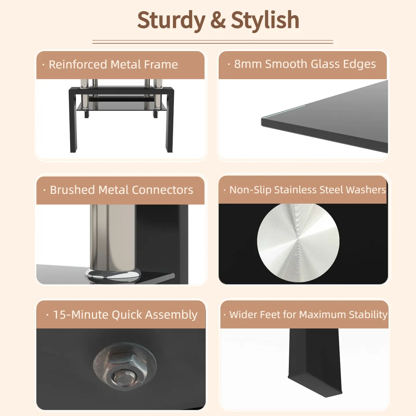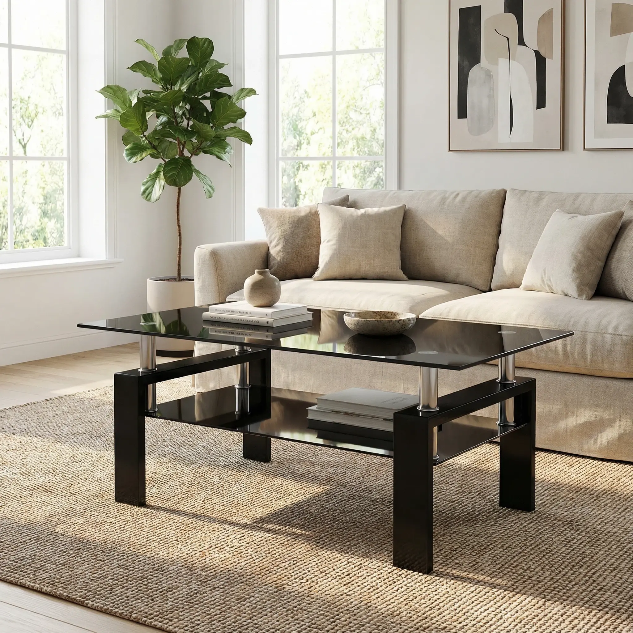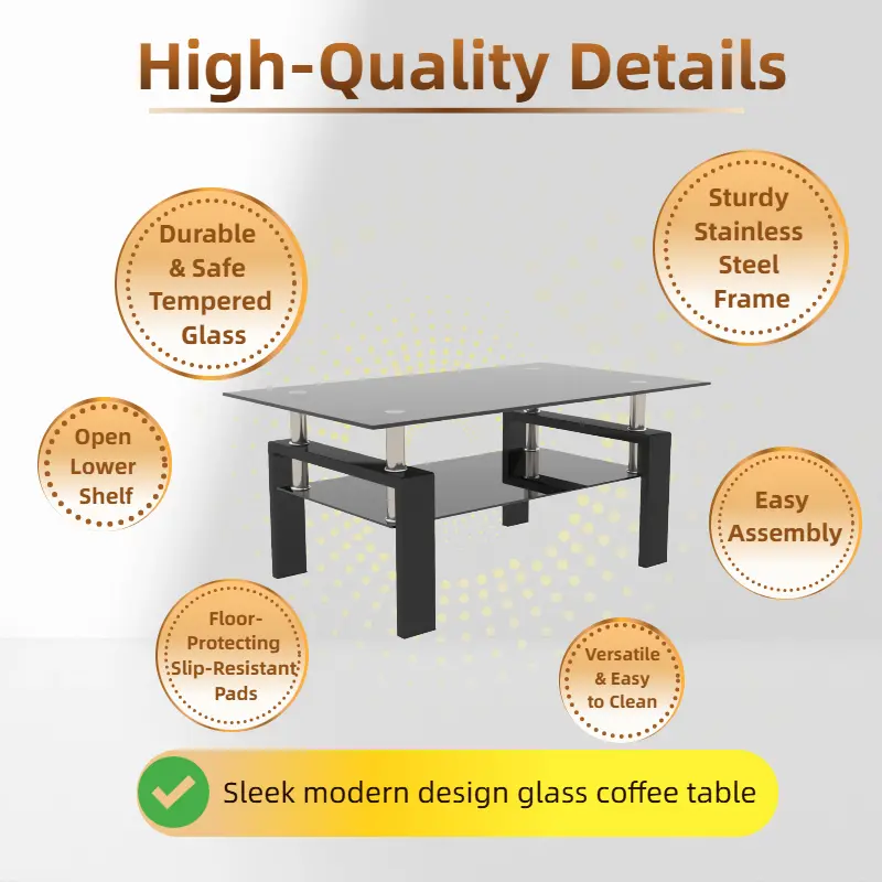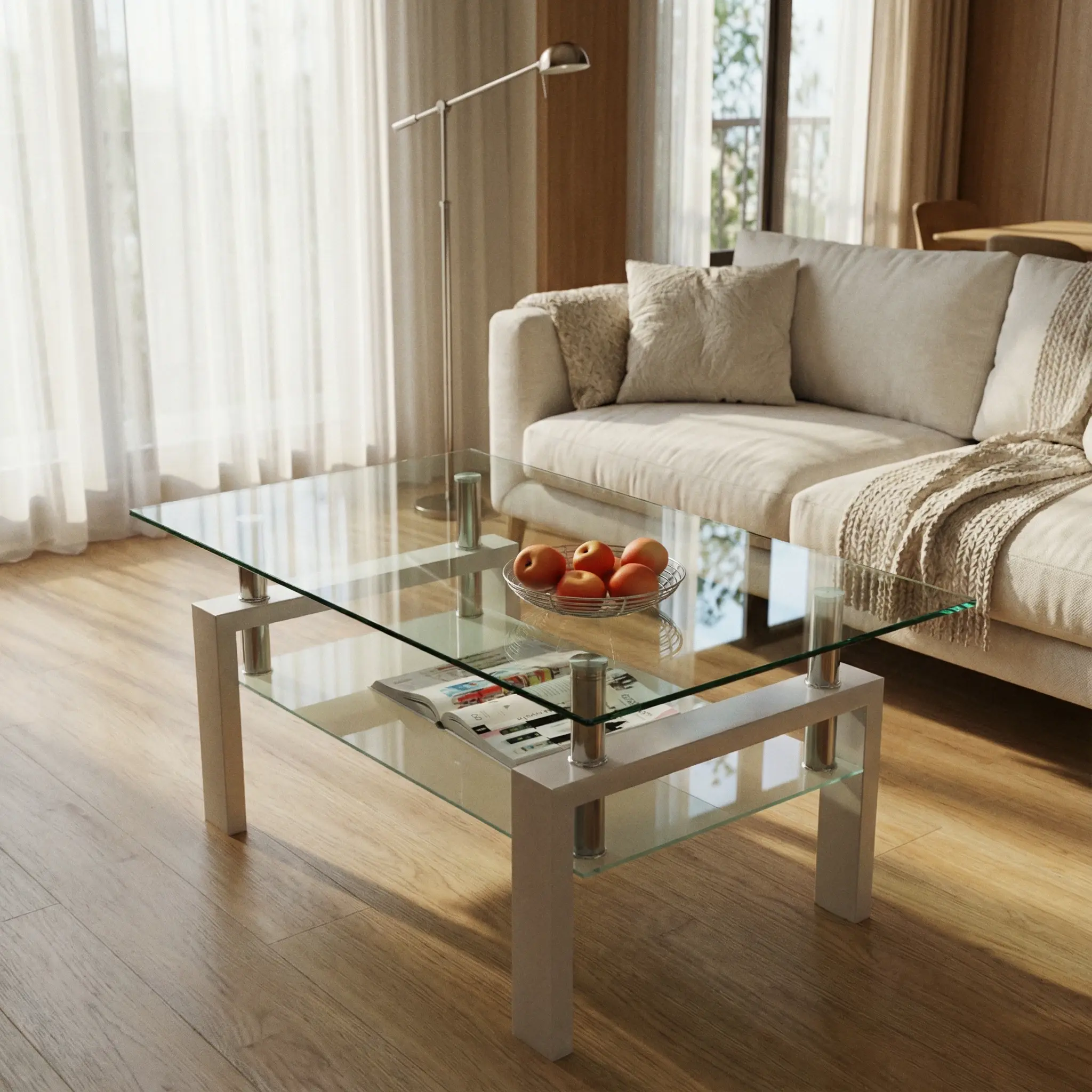 This glass coffee table boasts a white living room rectangle design. It features a tempered glass top and metal tube construction. The table includes 2 layers for storage, making it ideal for modern tea side tables. Its design complements various living room settings, adding elegance to your space.