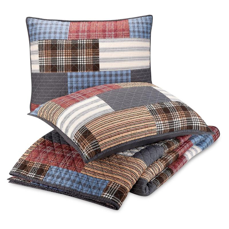 Embrace your rustic side with the Modern Heirloom Cabin Patchwork quilt set. A blend of plaids and stripes on 100% cotton brings a cozy, cabin-inspired look to your bedroom and reverses to solid grey for versatility. From Modern Heirloom.