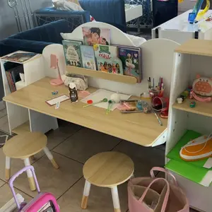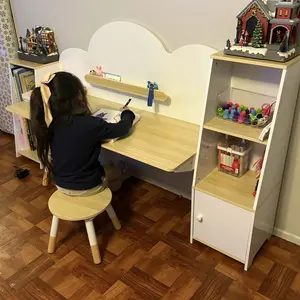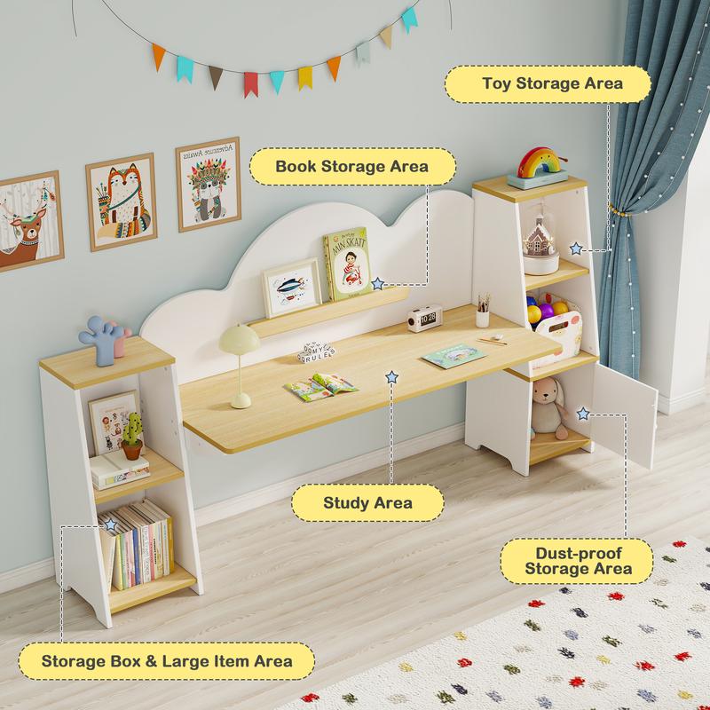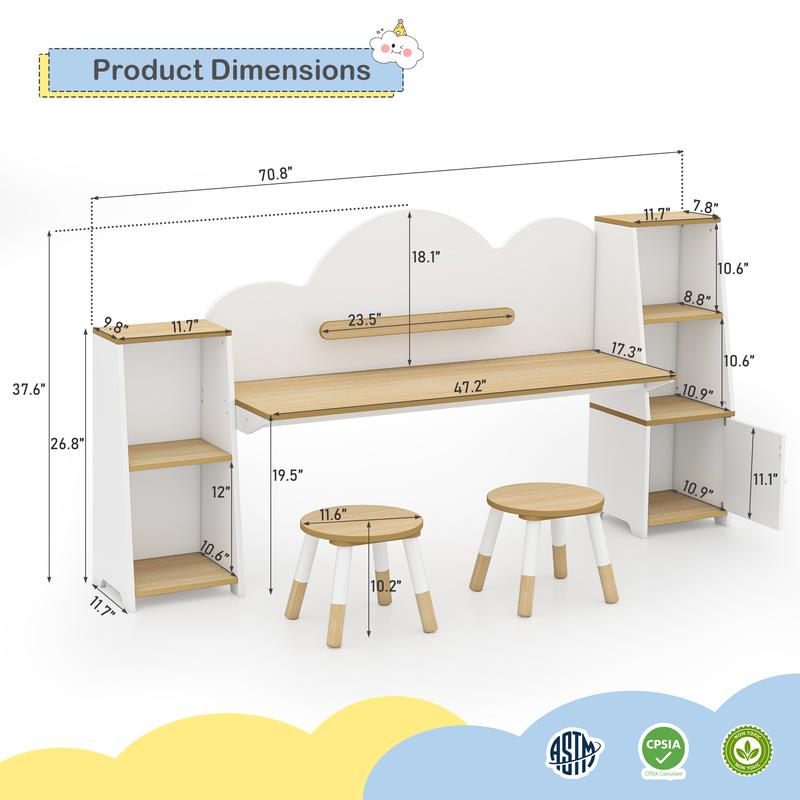 ·All-in-One Learning Station: Features a spacious 47" wide desktop, a charming cloud-shaped backboard, and a fixed shelf for books and supplies. Two included stools create a perfect spot for studying or creative play.