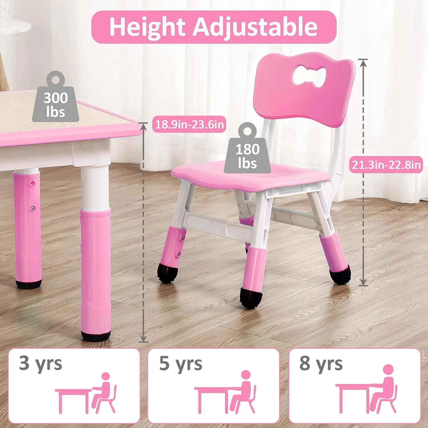 🎗️【Height Adjustable Kids Table Set】Both kids table and chair can easy adjust the height,which can adjust it from 18.9”to 23.6”,There is 3 level for chairs to adjust from 10.6”-12.2".By the way,these kids study table for 6 can bear up to 300lbs,and kids chair can also bear up to 200Lbs.Both the table and chair are easy to assemble. Just follow the instruction book having both printed directions and diagrams.