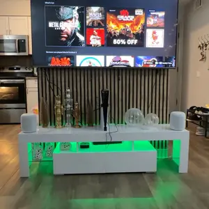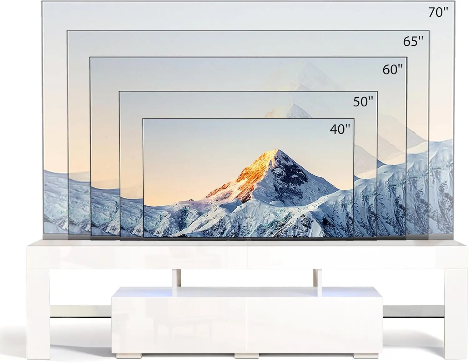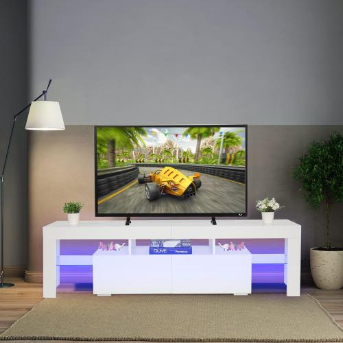 ·【MODERN DESIGN WITH LED LIGHT】: The mid century modern tv stand with the slick White design and glossy finish, features 2 glass shelves and the Blue LED lights system, right for your 65 inch TV screen. Cute blue lights, gives your room a good vibe and the lighting effect can be used as a night light.