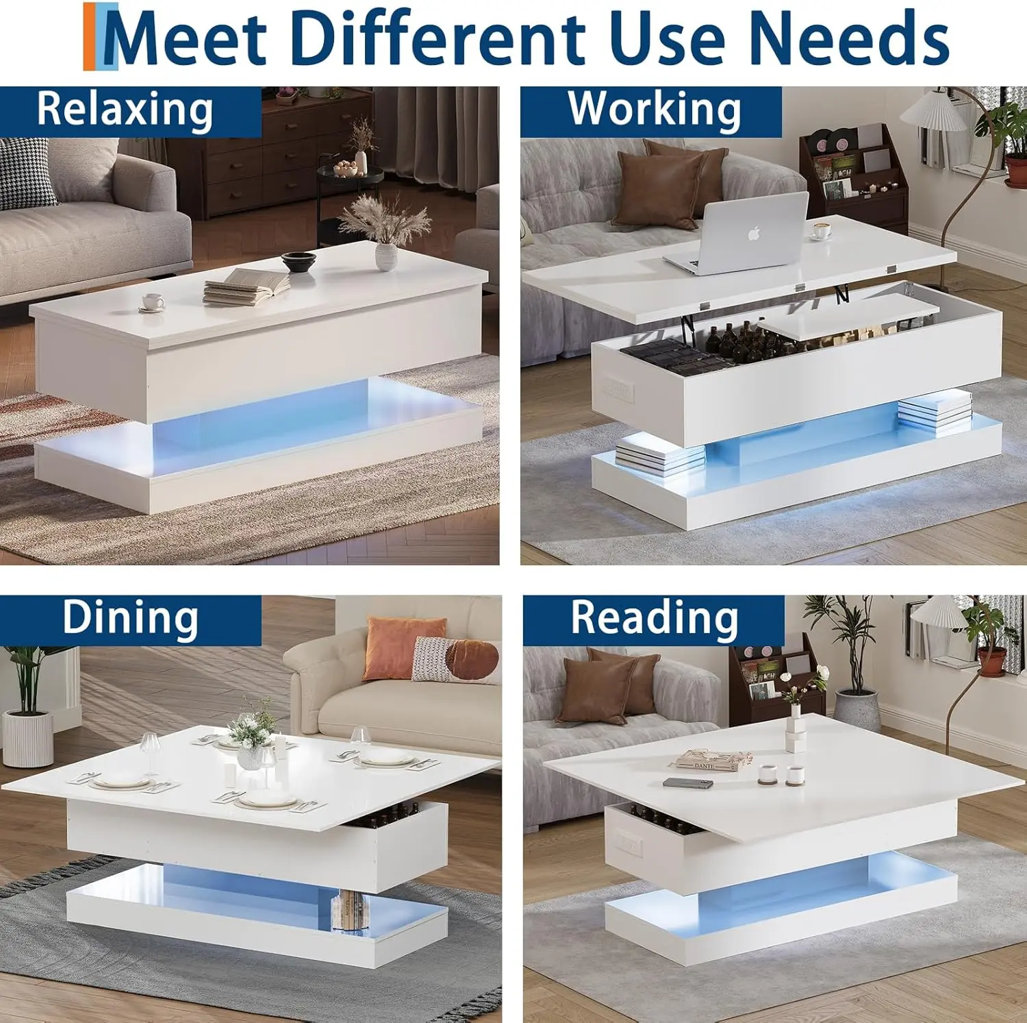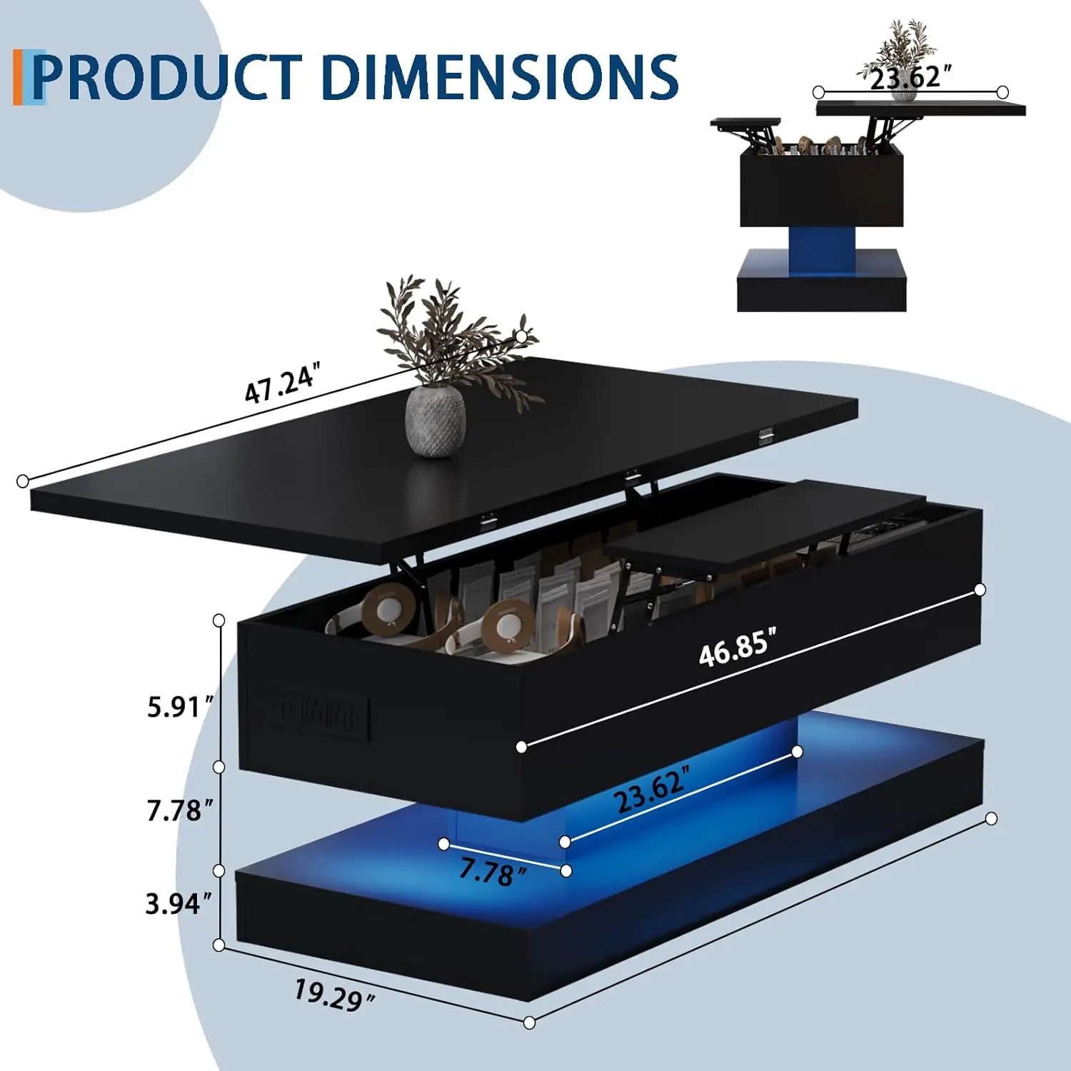 Adjustable Height Lift Top:Features a 47-inch tabletop that smoothly lifts up to 5.3 inches, transforming from a coffee table into a dining or work desk. The gas spring mechanism ensures effortless and stable height adjustment.