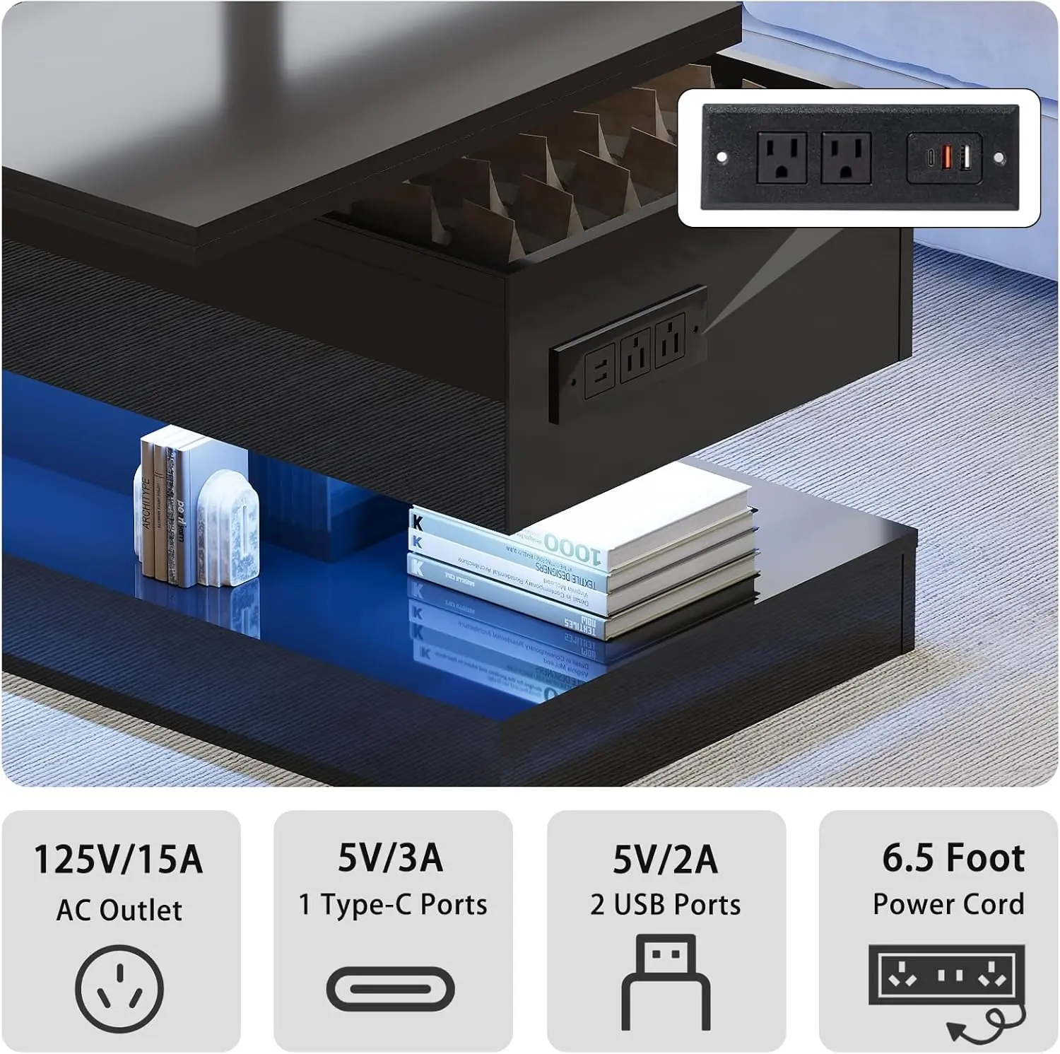 Integrated Power Charging Station:Includes 2 AC outlets and 2 USB ports with a 6.5-foot power cord. Conveniently charge laptops, phones, and gaming devices directly from the table.