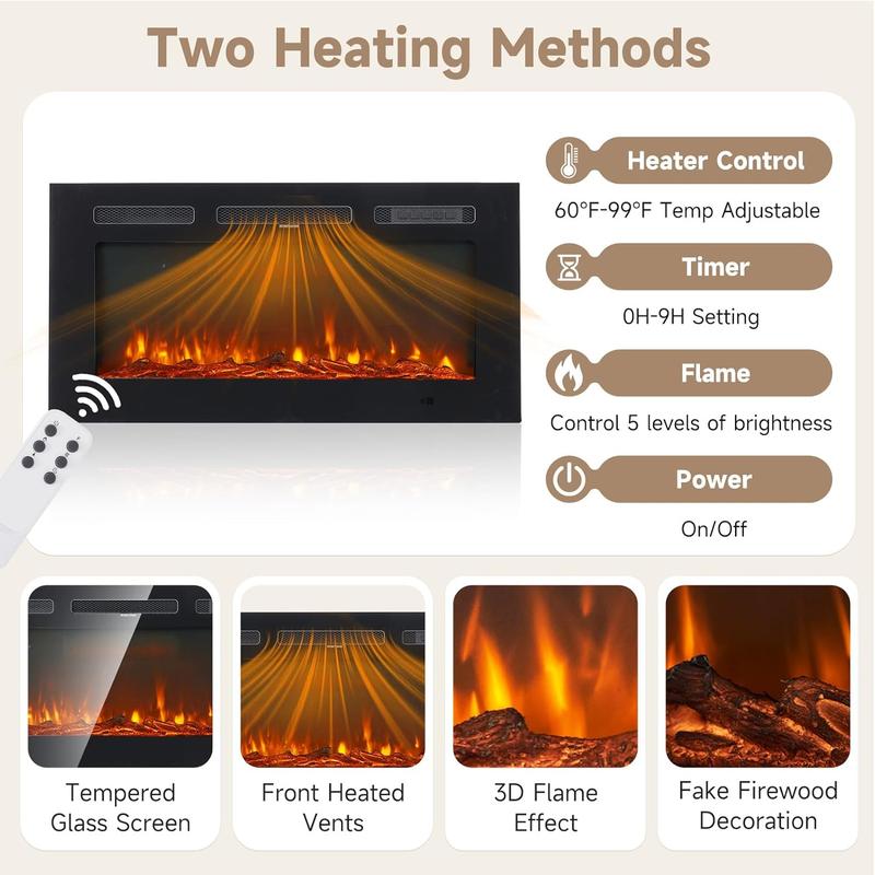 The 36-inch black fireplace with realistic crystal stones offers 5 levels of flame brightness and 12 flame colors. It creates a stunning visual effect and keeps you warm. With 12 colors of backlight and 12 LED light strips, users can create various ambience. Adjust the temperature from 60°F to 99°F and set a timer from 0 to 9 hours via remote control. 🌟