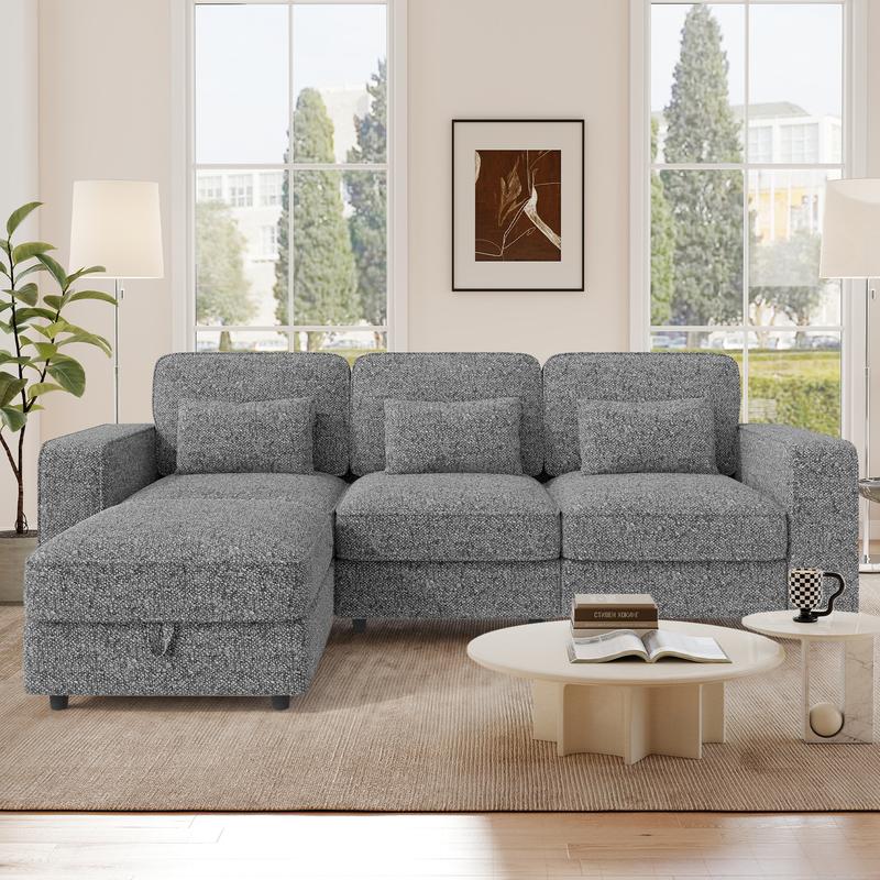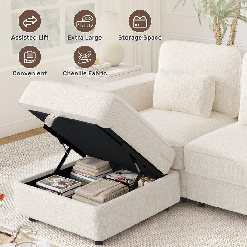 ·LARGE STORAGE SPACE: The sofa comes with a 25.6 inches L x 25.6 inches W x 4.8 inches D storage area under the chaise lounge, which makes it easy to organize blankets, cushions, books and seasonal items. The cushions can be lifted up to organize items conveniently, meeting the storage needs of most families and upgrading home storage solutions.