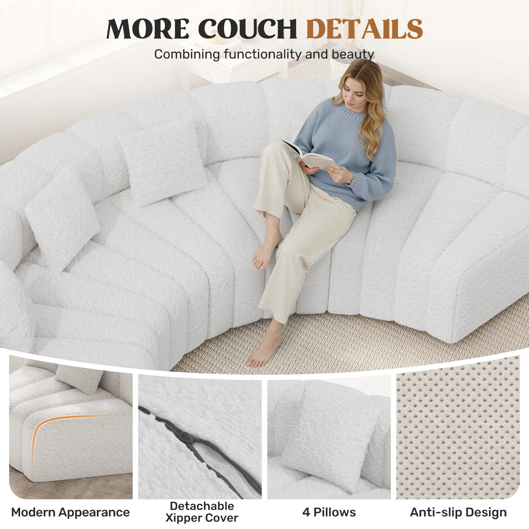 ·FLEXIBLE MODULAR COMBINATION: Unleash creativity with modular magic! This cloud sofa features a convertible configuration, allowing you to easily reconfigure it into various shapes such as U-shaped sectionals or curved setups, ensuring maximum flexibility for your space