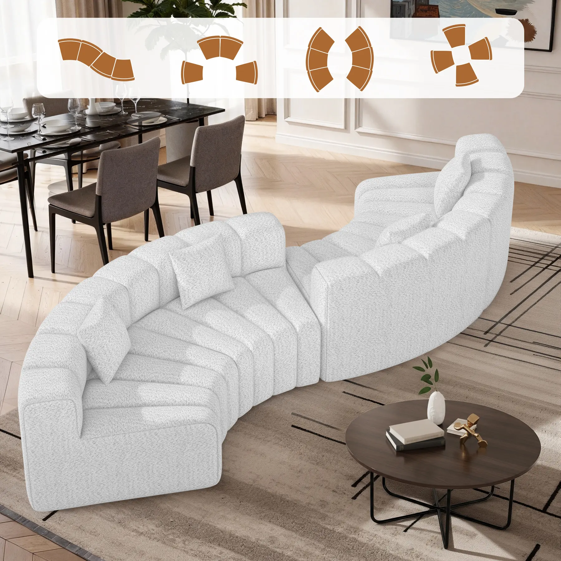 ·PREMIUM QUALITY FABRIC: Crafted from high-quality velvet fabric, this curved sofa offers a soft, luxurious feel while ensuring durability for everyday use. The plush texture of the pellet velvet sofa enhances the aesthetic appeal of any space, adding a touch of elegance and sophistication. Whether as a statement piece or a cozy retreat, this oversized sectional sofa combines style and functionality effortlessly