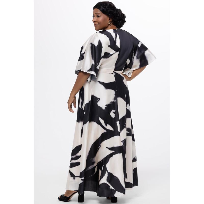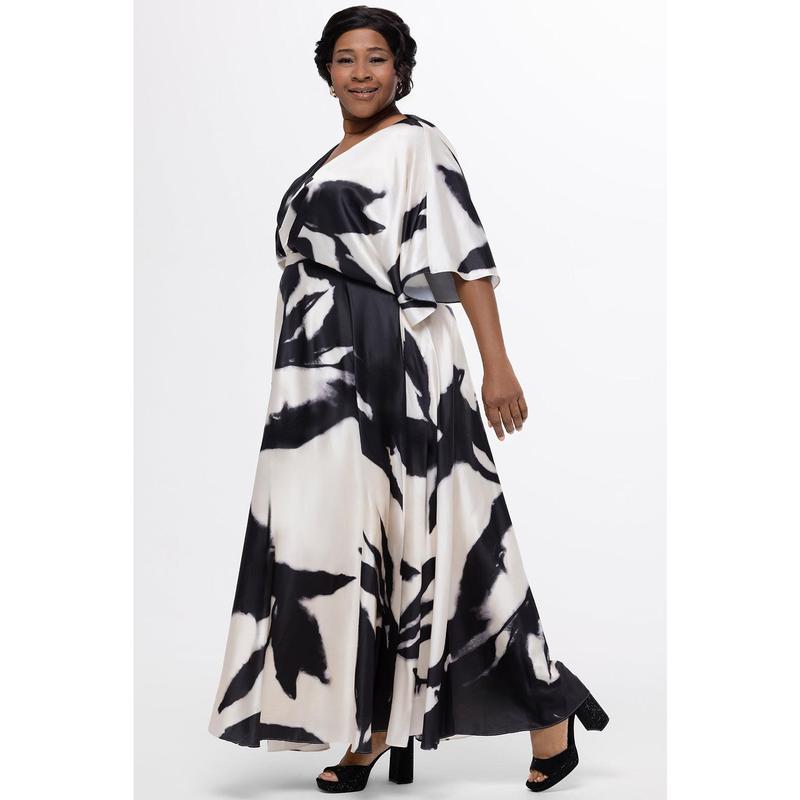 Take center stage when you wear Modern Muse, our dramatic plus-size satin print maxi dress. The bold abstract pattern of painterly black splashes on silky cream satin makes a dramatic fashion statement. The surplice V-neckline flatters the bust, while loose-fitting Dolman sleeves keep you cool and comfortable. An A-line skirt gives you playful pockets. This Summer or Spring maxi dress in plus sizes is sure to earn compliments for brunches, garden parties, poolside, or beach, destination, or informal weddings, or resort getaways.  Dress it up for a fancy invite with high heels and a patent leather clutch purse. Dress it down for a casual event with platform sandals and your choice of a black or cream straw brim hat.  Either look, let the compliments roll.  Sydney's Closet Style CE2620 shown in Black and Cream abstract satin print.