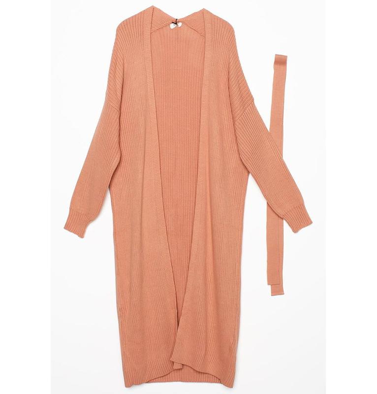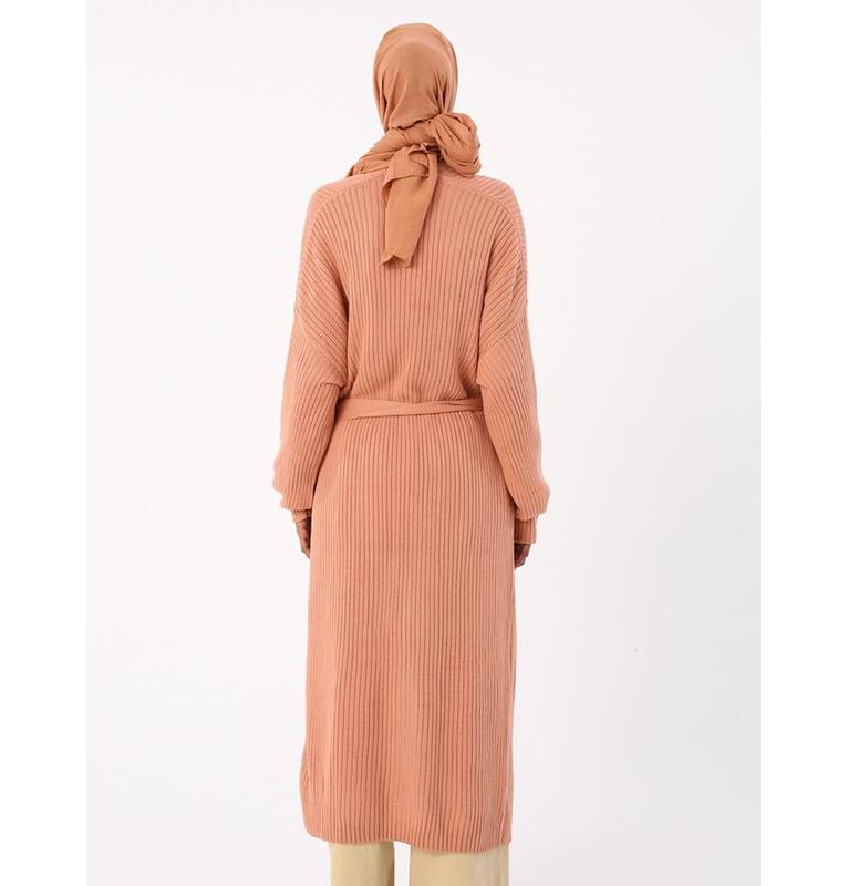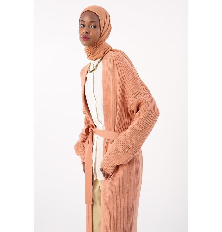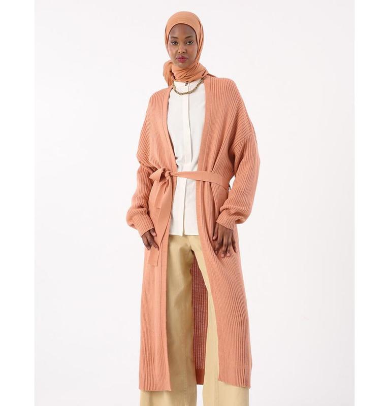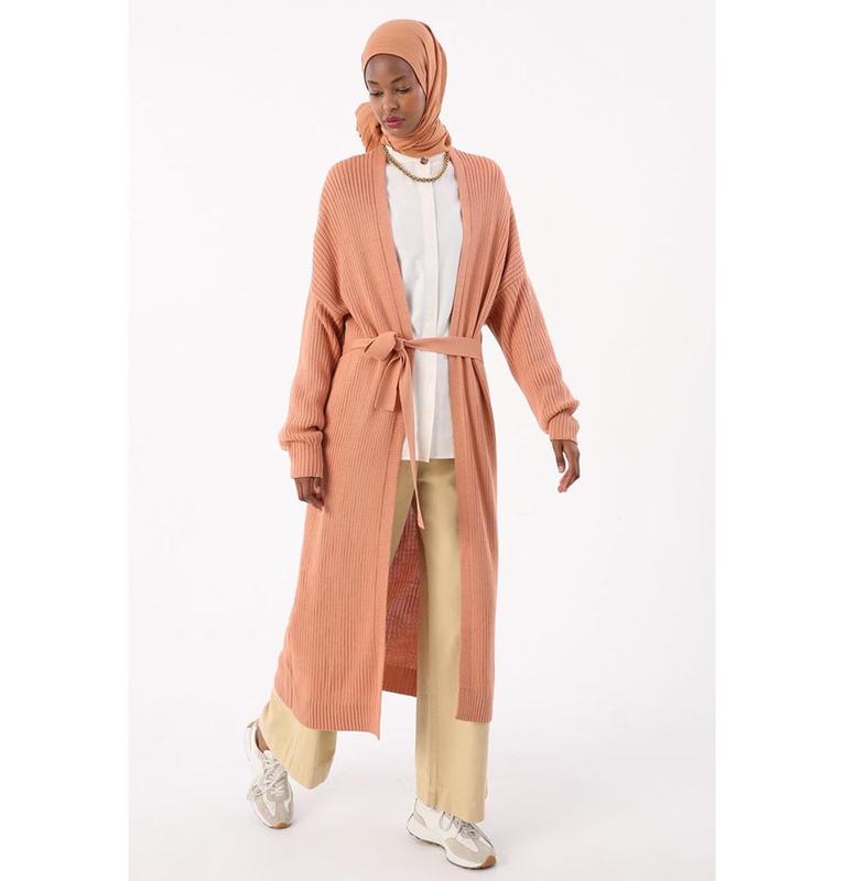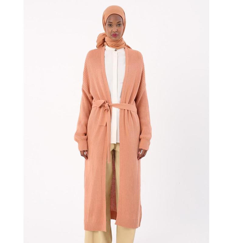 Modern Muslim Women's Belted Long Knitted Cardigan - Pink