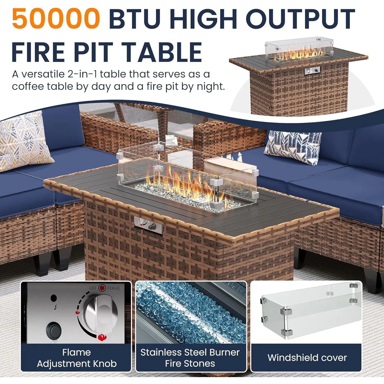 Safe & Efficient, More Warm: The smokeless propane patio fire pit table has passed CSA certification to ensure quality and safety. Equipped with a stainless burner and auto-ignition button, it can heat up to 50,000 BTU. Our patio furniture set with fire pit table also features a metal tabletop, so you can use it as an outdoor dining or coffee table during the day. Enjoy party time to the fullest, whether it's day or night.