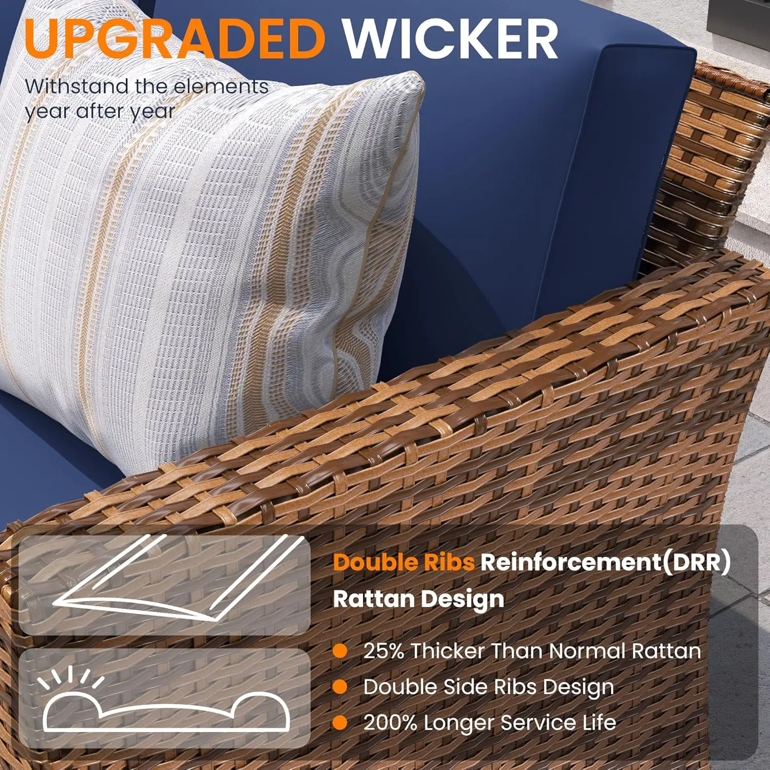 FSC Certified Material: Crafted with a frame made of FSC-certified wood, the outdoor patio furniture sets with cushions feature ultra-high resilience foam filling and high-density composite fabric for outstanding resistance to deformation, UV rays, and abrasion. The high-quality metal components and tightly woven, all-weather rattan ensure that the outdoor couch withstands the elements year after year.