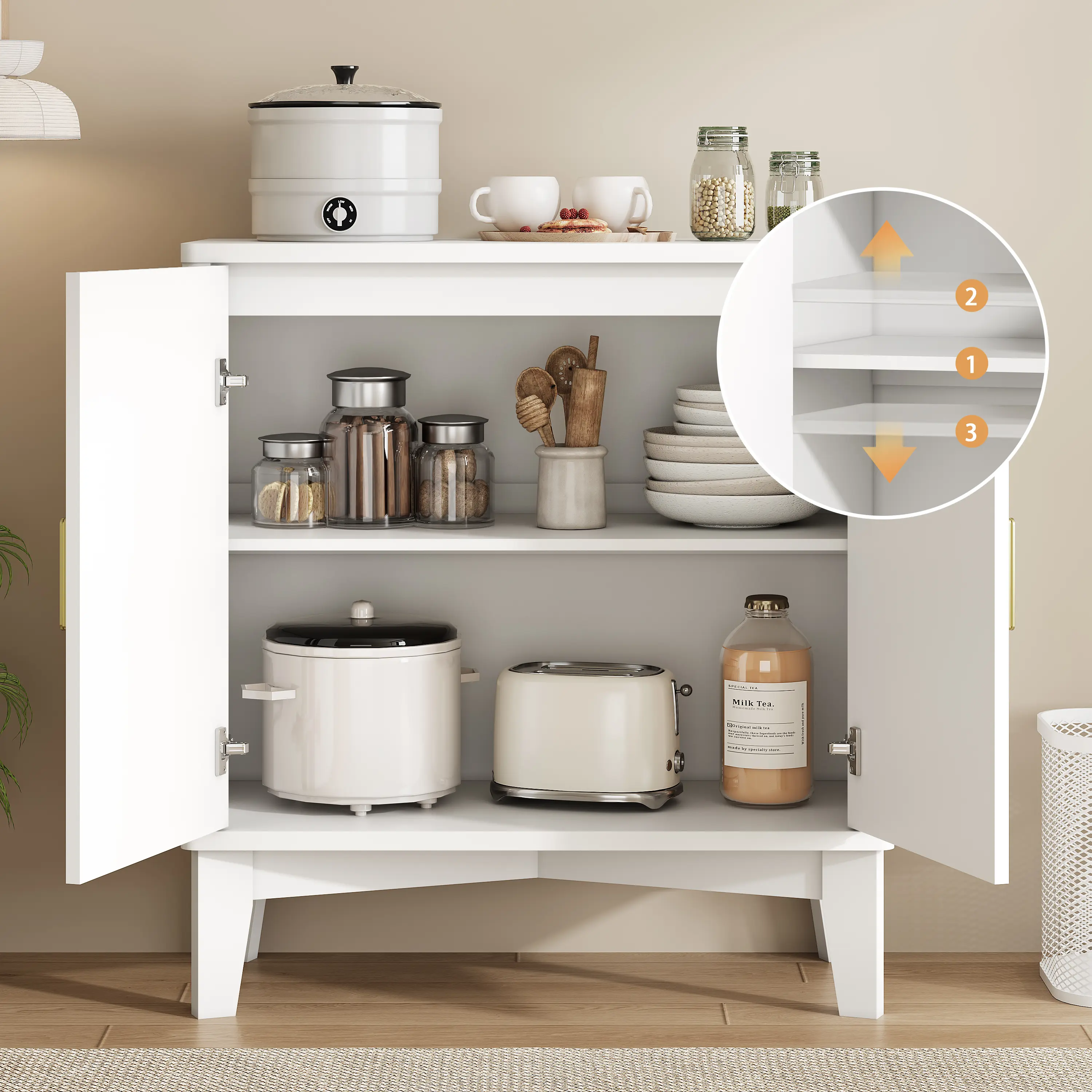 ·Spacious Storage Cabinet with Adjustable Shelf: Storage cabinet with doors and shelves provides flexible organization options. The adjustable interior shelf makes it easy to store dishes, canned goods, or small appliances—perfect as a kitchen pantry cabinet, accent cabinet, or entryway cabinet.