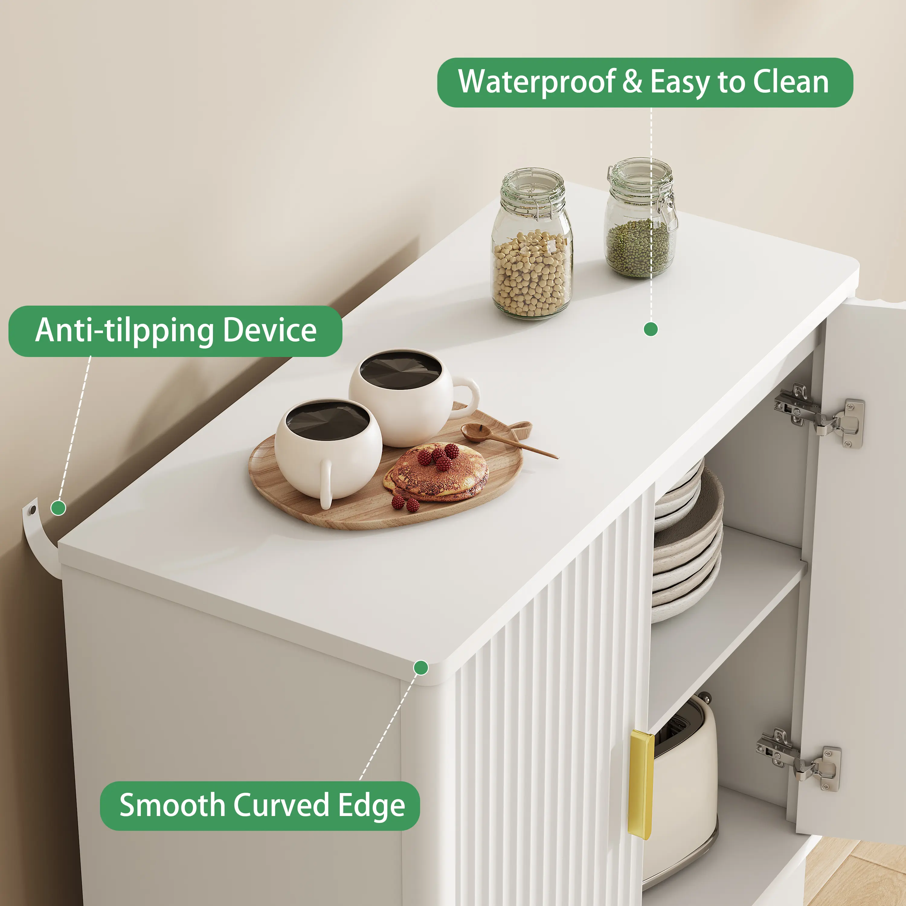 ·Durable & Safe P2 Engineered Wood Construction: Built from waterproof, scratch-resistant P2 engineered wood, this sideboard cabinet is designed for long-term use. Includes anti-tip hardware for safety—great for households with kids or pets. A perfect replacement for outdated kitchen storage cabinets.