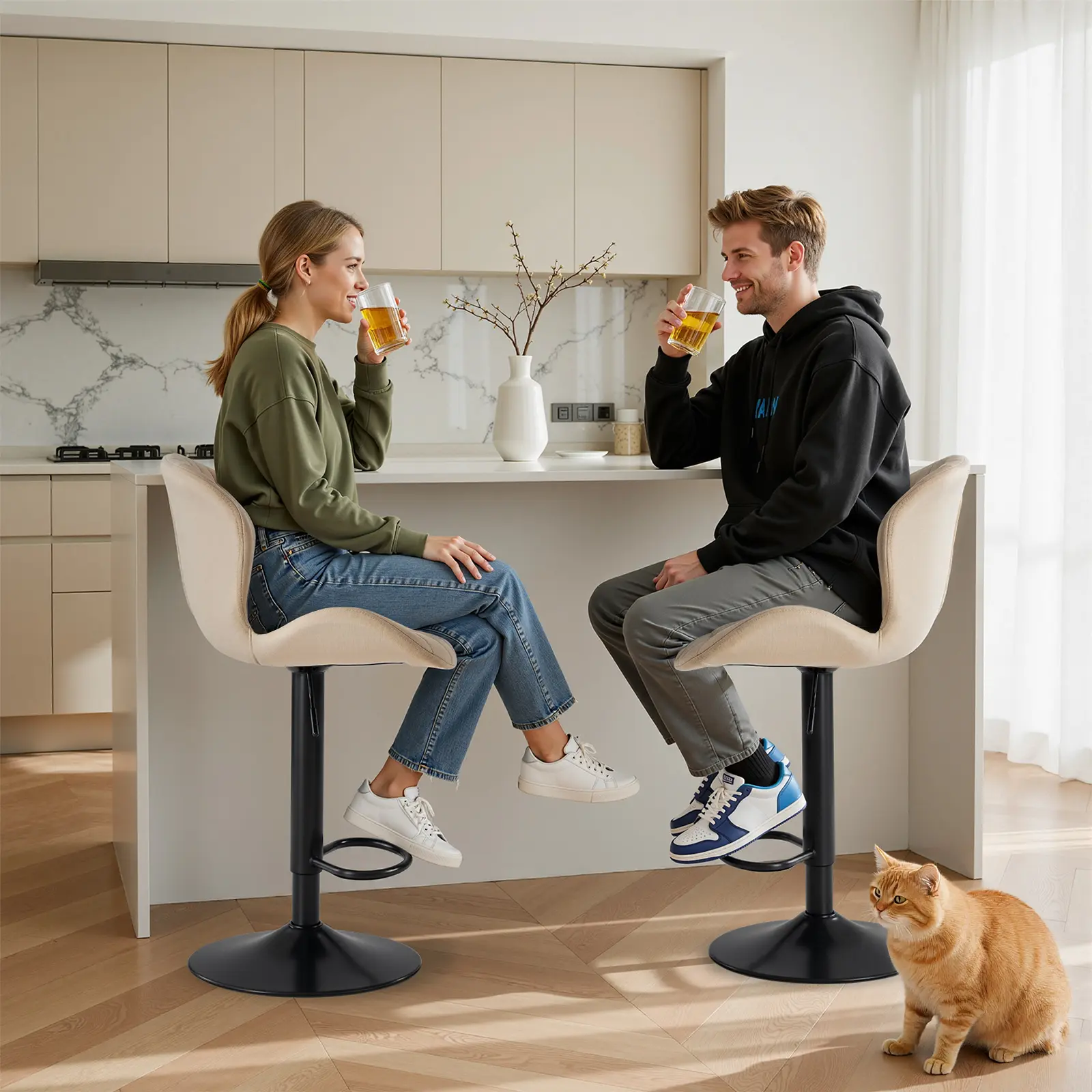 Designed for comfort and flexibility, these bar stools feature an adjustable seat height from 24.8" to 33.46". Perfect for 36"–45" counters and bar tables. The smooth 360° swivel lets you turn freely, ideal for dining, chatting, or hosting friends. One stool, endless uses.