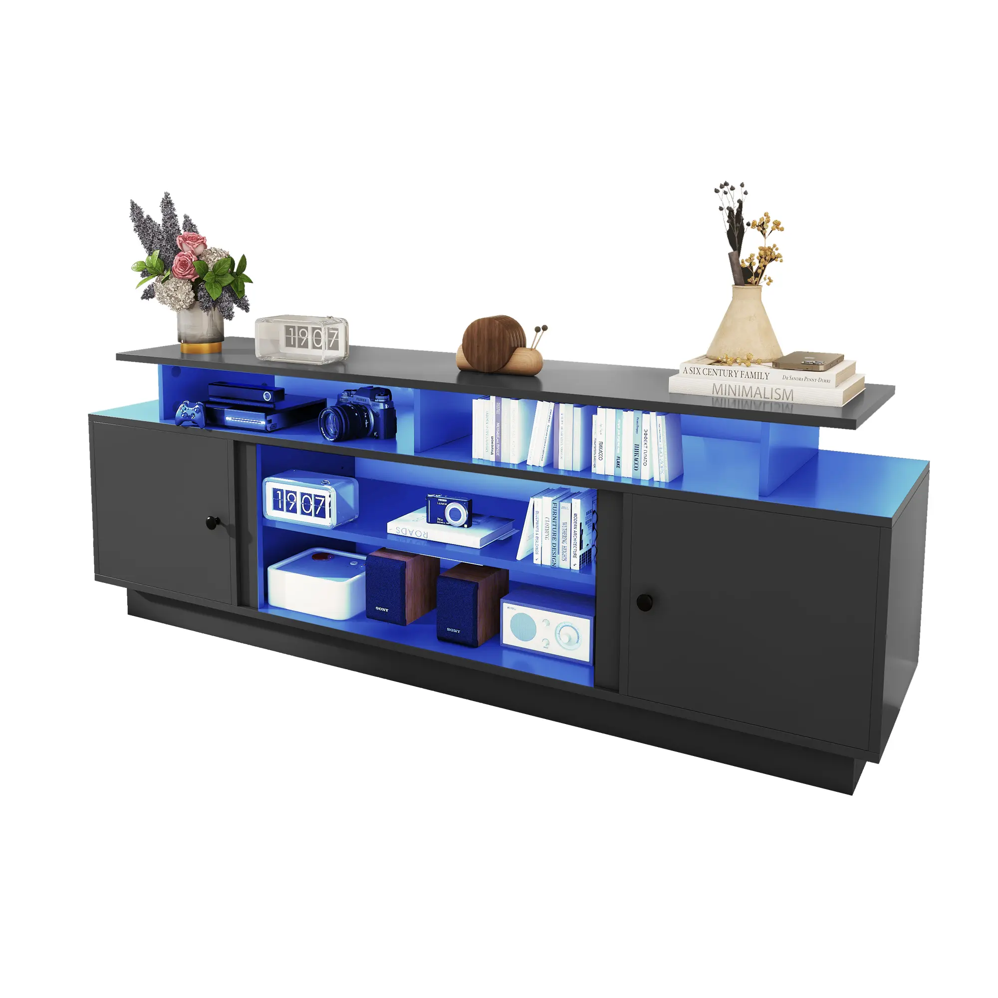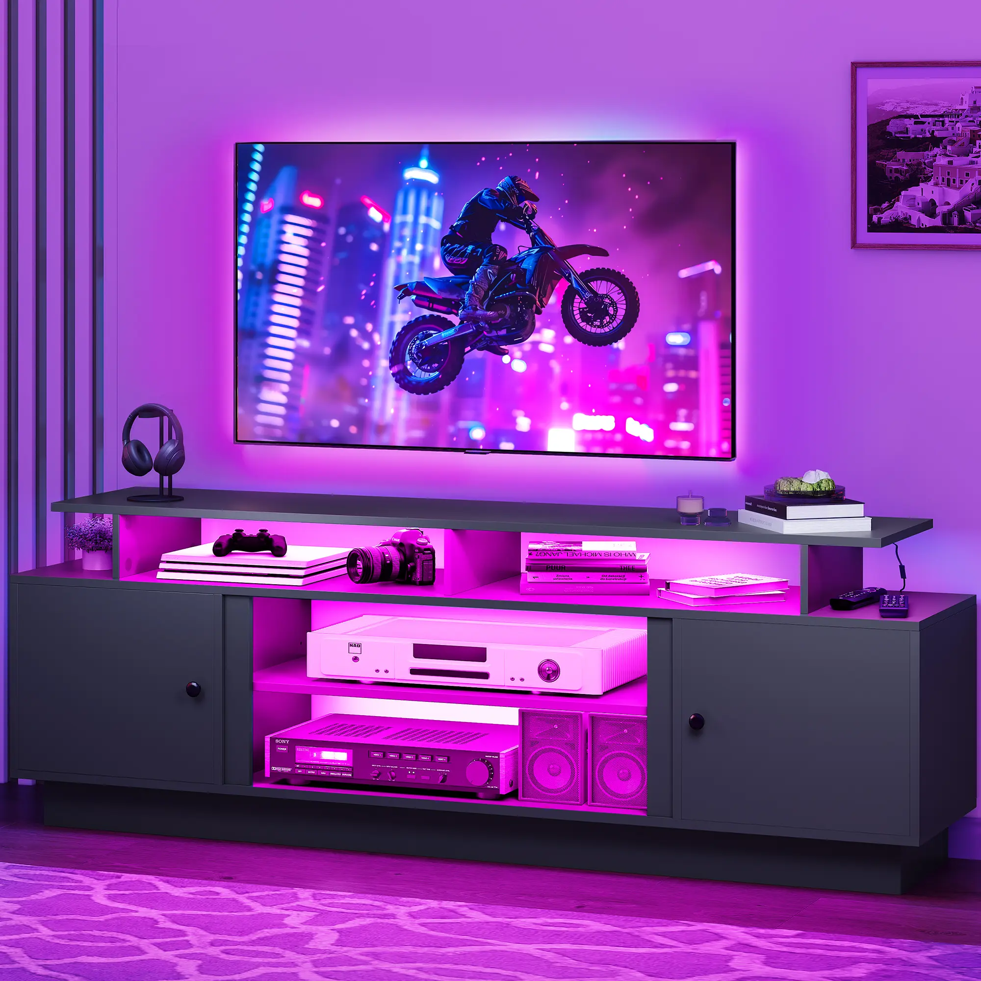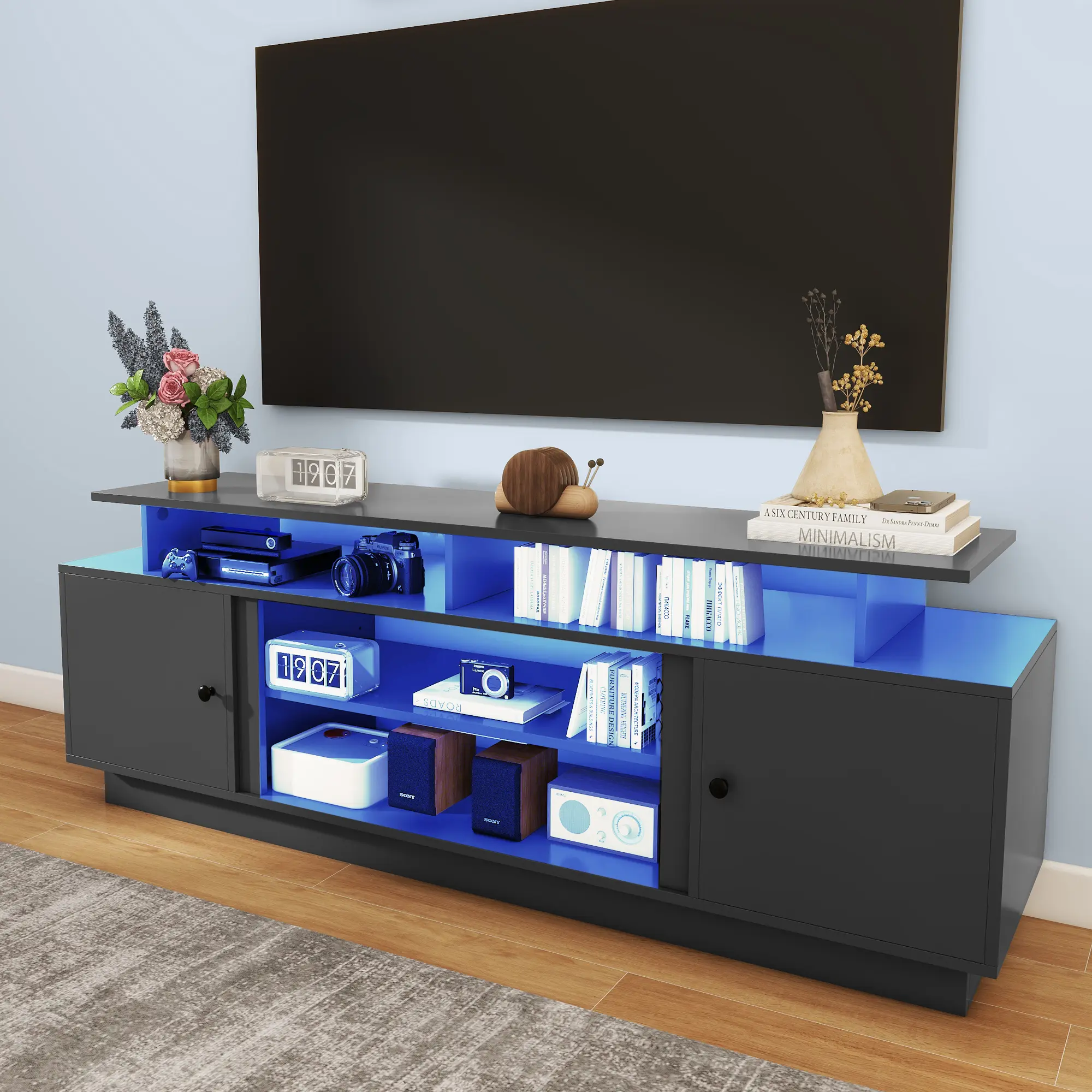 --Adequate Storage Space: The entertainment center features 2 cabinets that provide generous storage space for your entertainment accessories; It also includes adjustable partitions and open compartments that offers versatile storage options to organize your belongings effectively