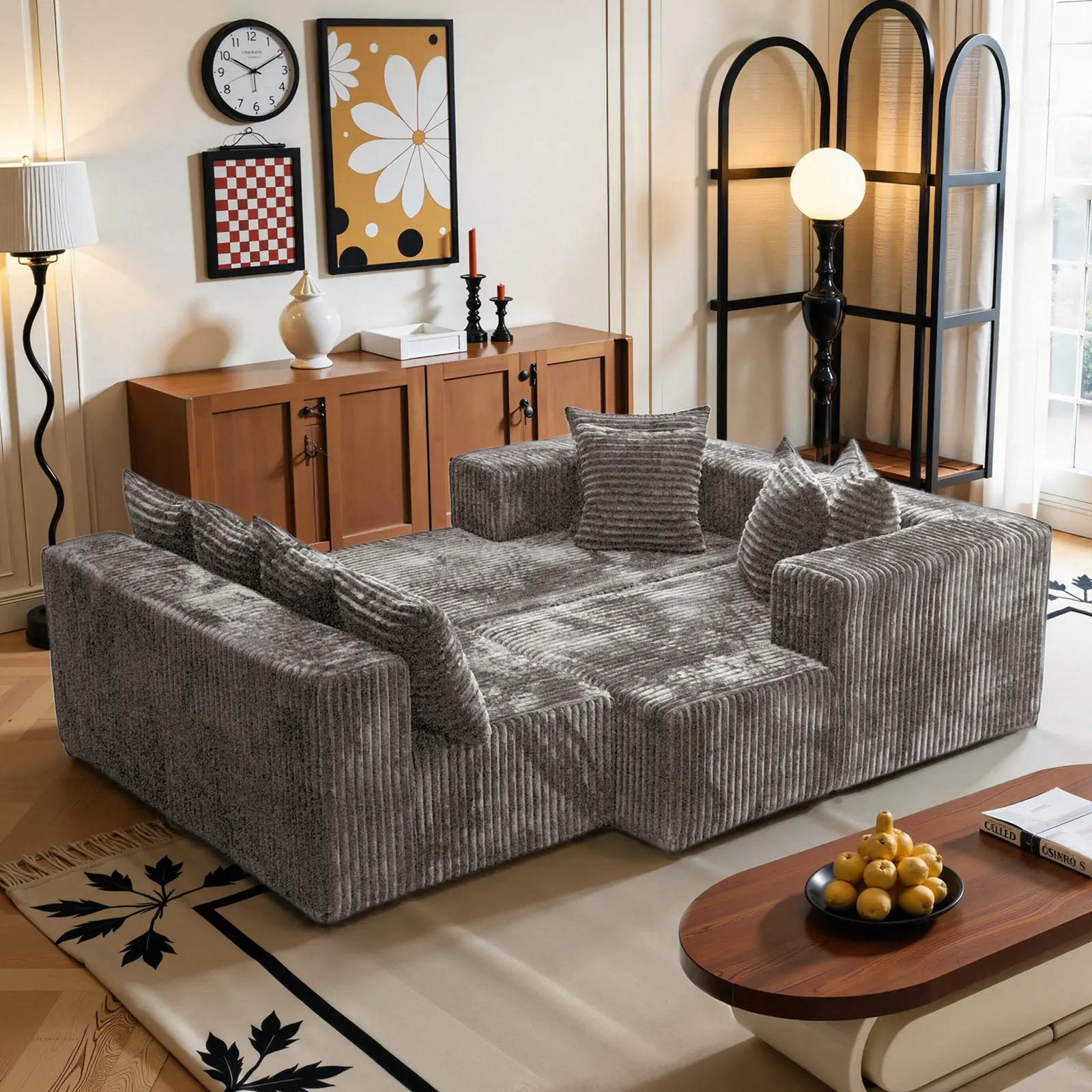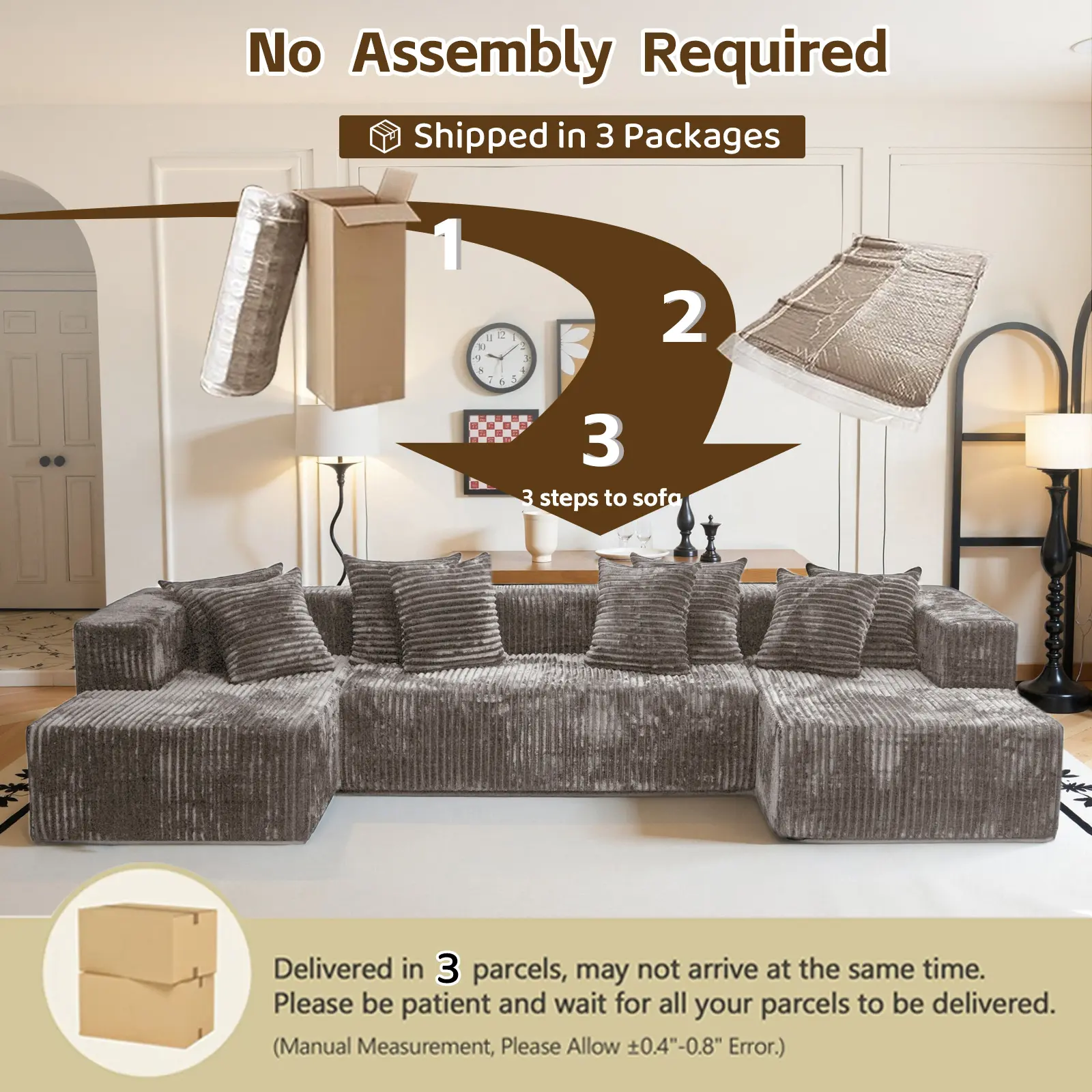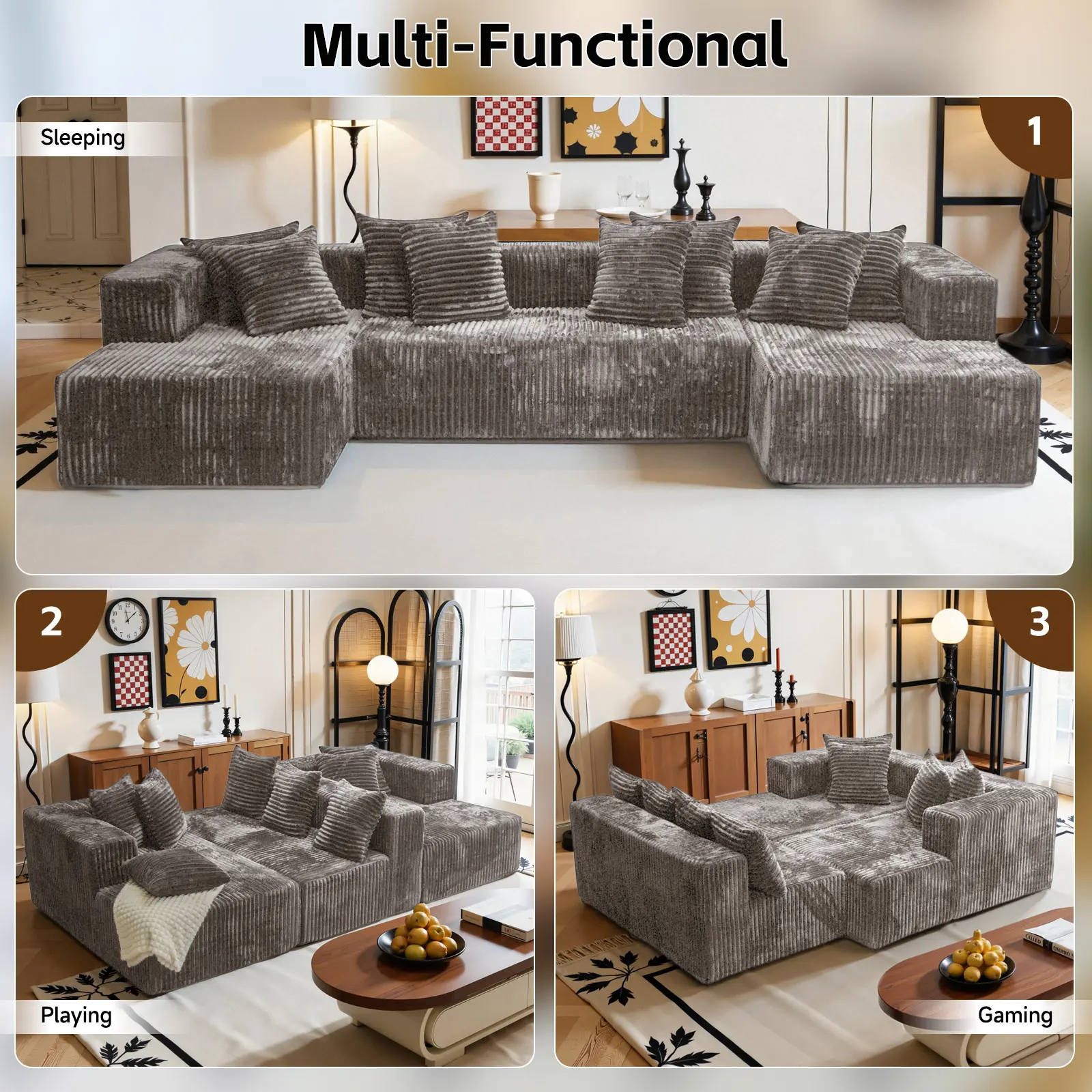 【3 Packages shipping】132"U-Shape Modular Sectional CouchSofa Compressed Corduroy Modern Sleeper Sofafor Living Room,Space-Efficient Modular FloorSofa with Soft Velvet Fabric and Deep SeatSofaConvertible Corduroy Sectional Couch bed plus