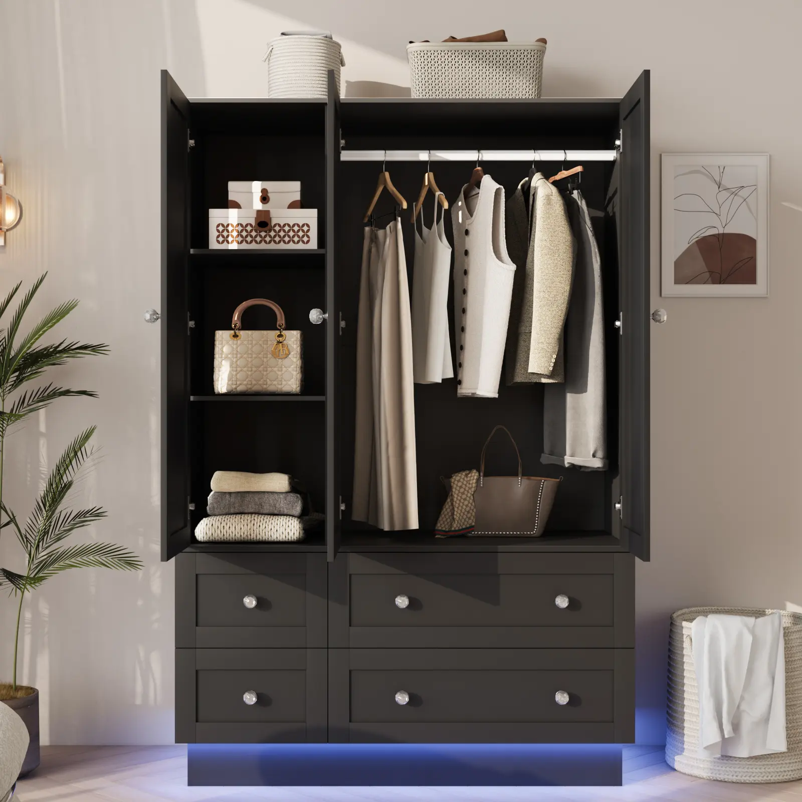【STRONG STORAGE】This wardrobe has a heel hanging rod and 4 drawers, which provides a wide range of clothing storage and plenty of storage space to meet your different needs. You can easily store clothes, pillows, quilts, handbags and other items.