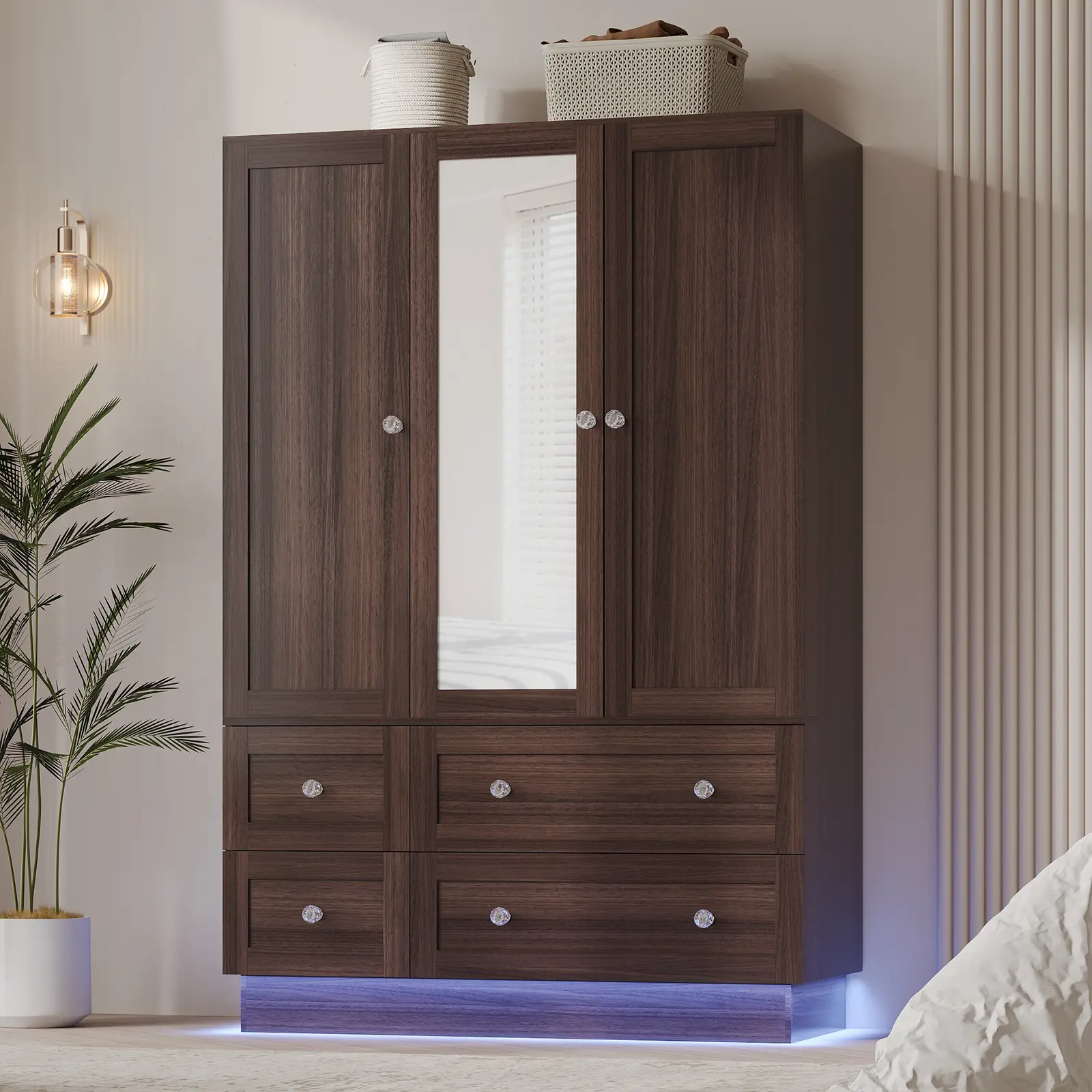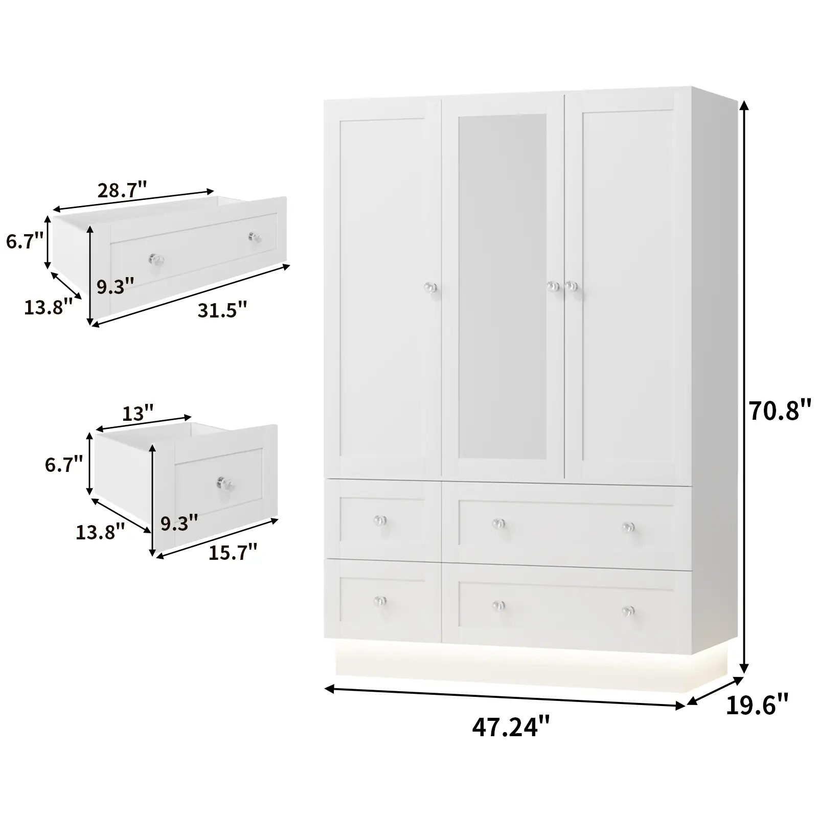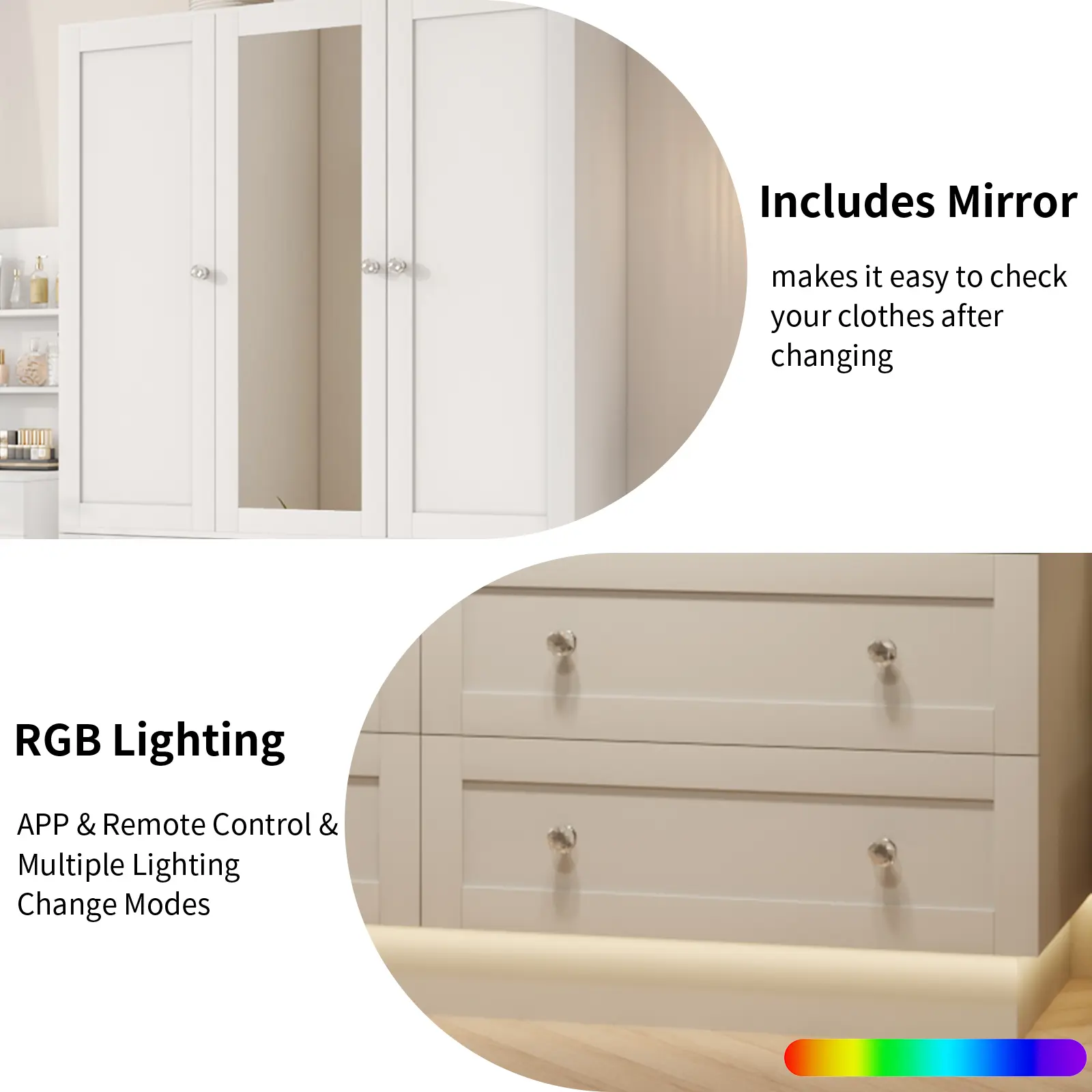 【MODERN AND SIMPLE DESIGN】This wardrobe boasts a sleek, minimalist design with a built-in mirror and vibrant RGB lights, adding both style and functionality to any room. Standing at 70.8" tall, it perfectly complements modern small-space furniture, enhancing the sophistication of your bedroom or living room.