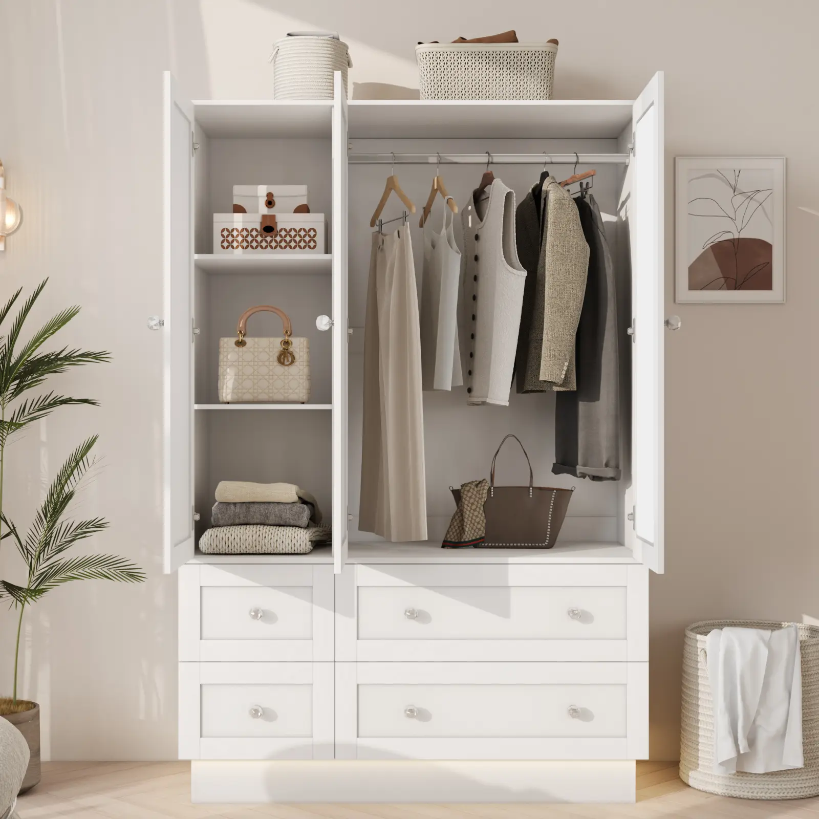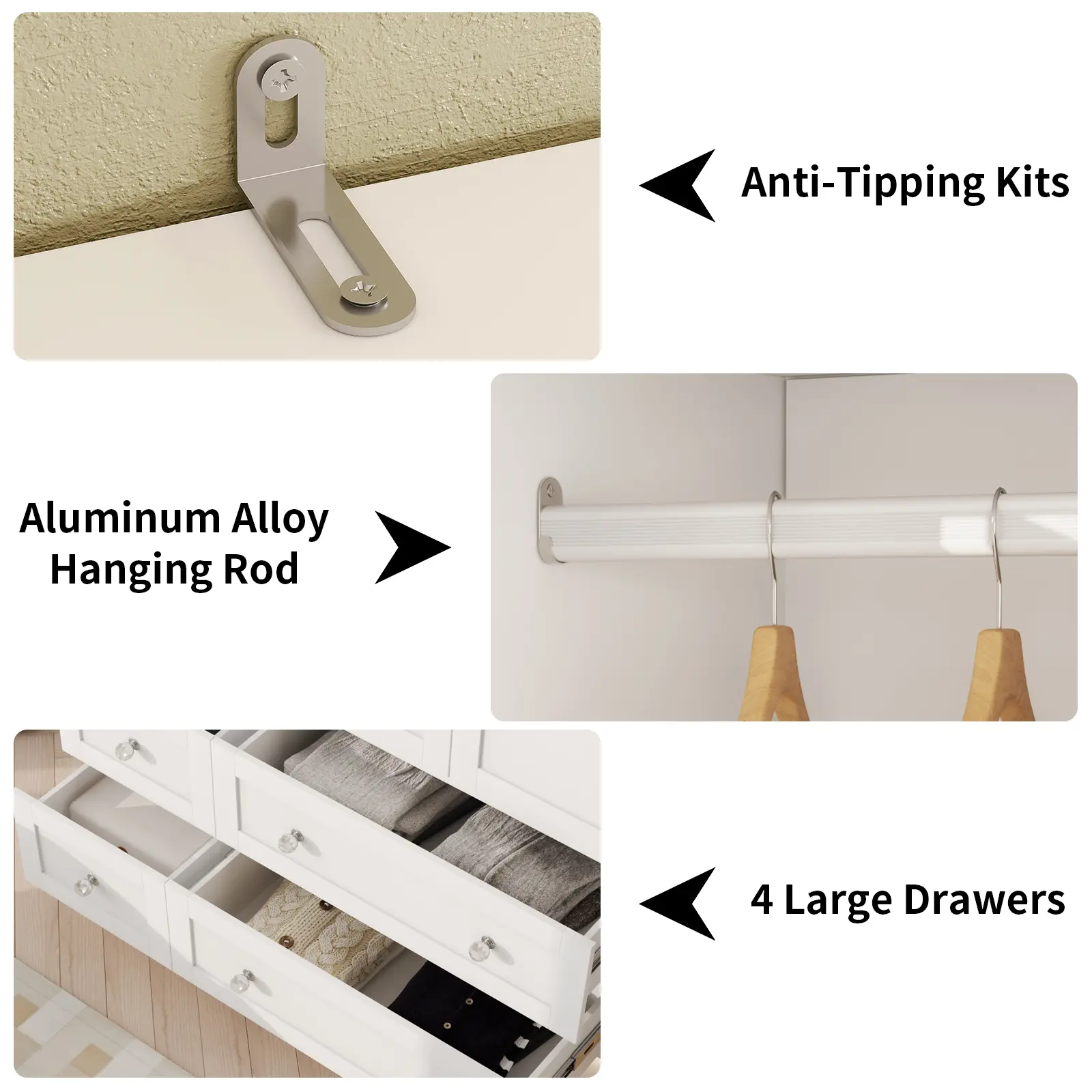 【STRONG STORAGE】This wardrobe has a heel hanging rod and 4 drawers, which provides a wide range of clothing storage and plenty of storage space to meet your different needs. You can easily store clothes, pillows, quilts, handbags and other items.