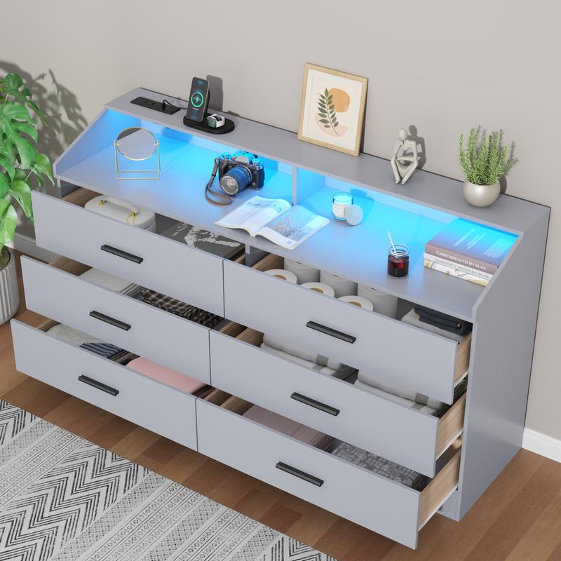 Dresser with LED Lights: This modern dresser is equipped with adjustable LED light strips, the colors and brightness can be freely adjusted through the button and app, making your furniture more diverse and stylish. Moreover, the light colors can be changed with the rhythm of the songs, and the App also has a timer setting so you can set the time to control the lighting on or off according to your needs.