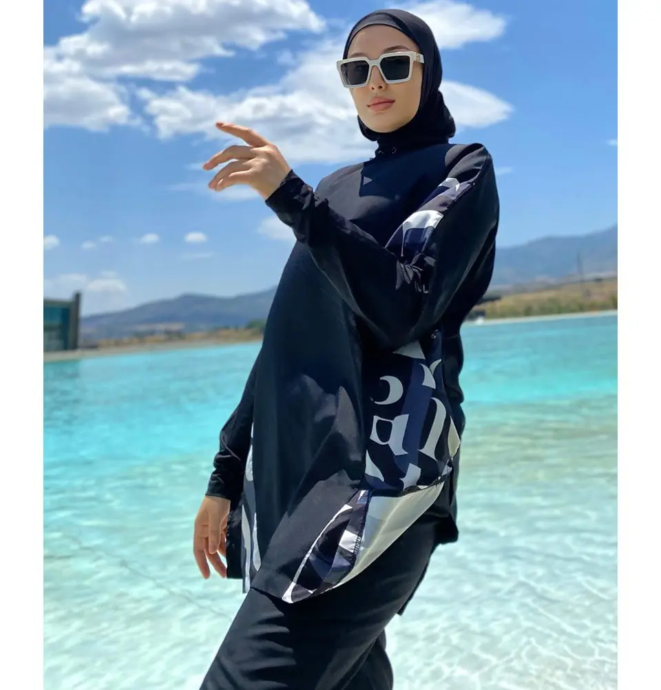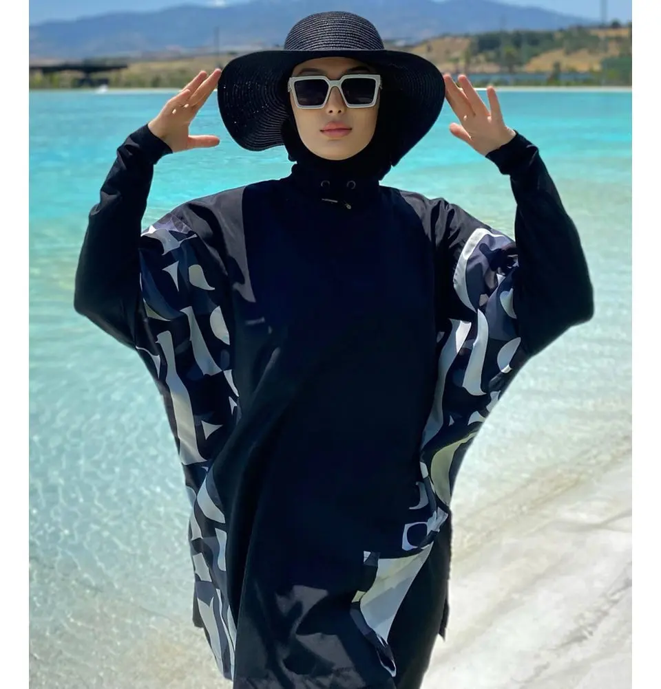 Women's Two Piece Full Coverage Modest Swimsuit - M2277 Abstract Black This stylish modest burkini swimsuit will keep you covered while enjoying your next beach vacation. Our swimwear is designed to be functional and cute while maintaining Islamic values of modesty. Please note: Does not include the hat in the photos FEATURES: - Loose, modest fit - Tunic is a batwing style - Mock neck with elastic that can be tightened to desired fit - Zips part way down in the back - Pants are jogger stlye, with elastic at the waist and ankles - Includes tunic, pants, swim bra, and swim turban hijab FABRIC: - Lightweight and durable nylon - Hydrophobic finish Made in Turkey