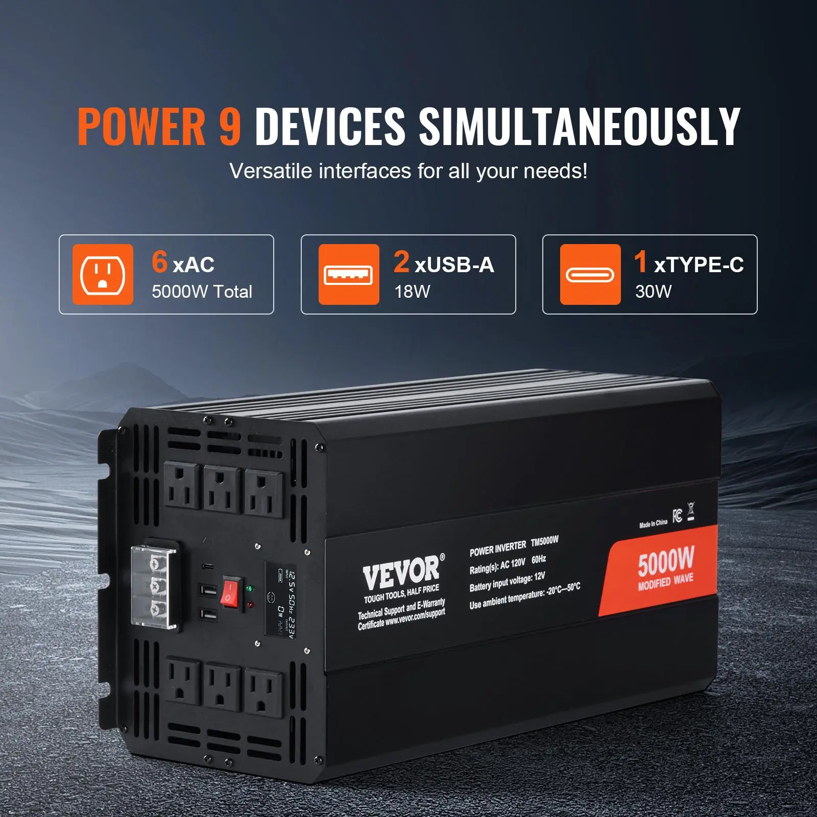 5. VEVOR Modified Sine Wave Inverter, TikTokShopBlackFriday, Max. 5000W, DC 12V to AC 120V Power Inverter with 6 AC Outlets 2 USB Port 1 Type-C Port, LCD Display and Remote Controller for High Load Home Appliances