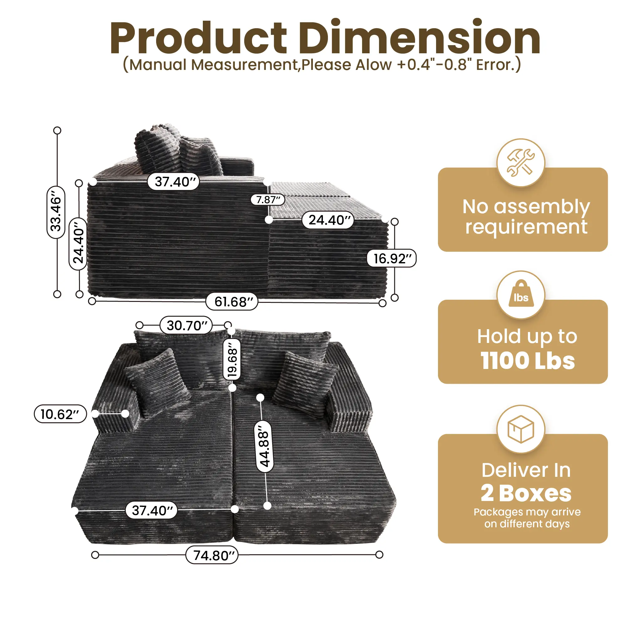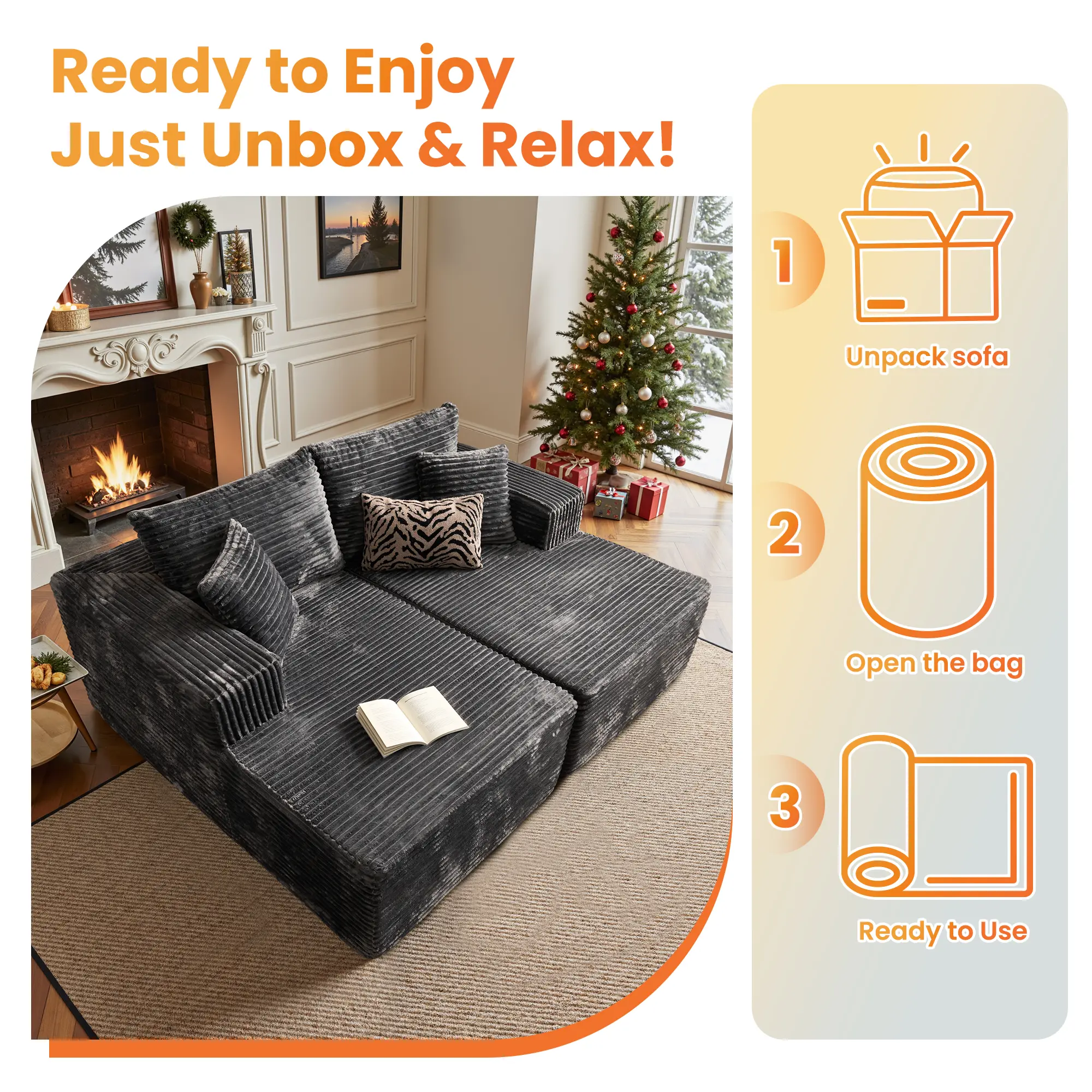 Forget the hassle of assembly. Simply unbox and tap each segment to restore its springiness. Full revival may take up to 72 hours, allowing you to enjoy your new sofa set with ease.