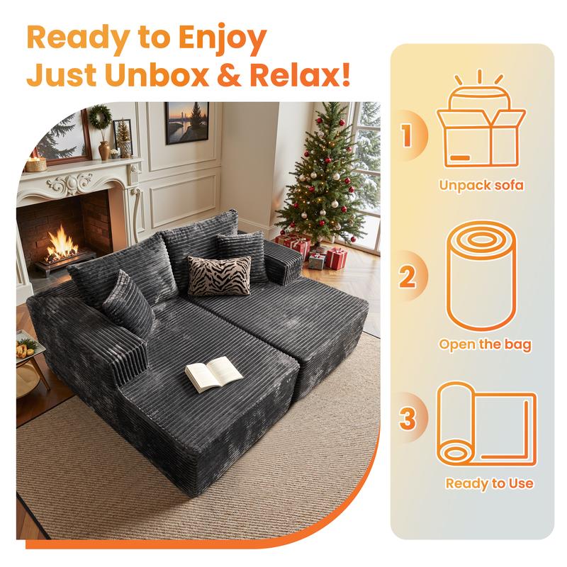Ideal for living rooms, apartments, bedrooms, and play zones, this modular sofa navigates through tight spaces effortlessly. Its versatile design adapts to any room, making it a practical and stylish choice. Product information Items Included Chaise *1 , Couch *1, Ottoman *1 Dimension 80.00" W x 69.30" D x 35.40" H Item Weight 172.8 Pounds Product Type Sofa Chaise Shape L-Shaped Sofa / Sofa Bed Number of Pieces 2 Seating Capacity 3 Seat Height 17.00" Seat Depth 59.00" Weight Limit 650 Pounds Fabric Material Plush Corduroy Fabric Fill Material Polyester, Foam, Pocket Spring, Cotton Product Care Spot clean with damp cloth Assembly No Assembly Required