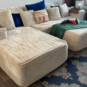 Beige Plush Corduroy Left Chaise, With Ottoman