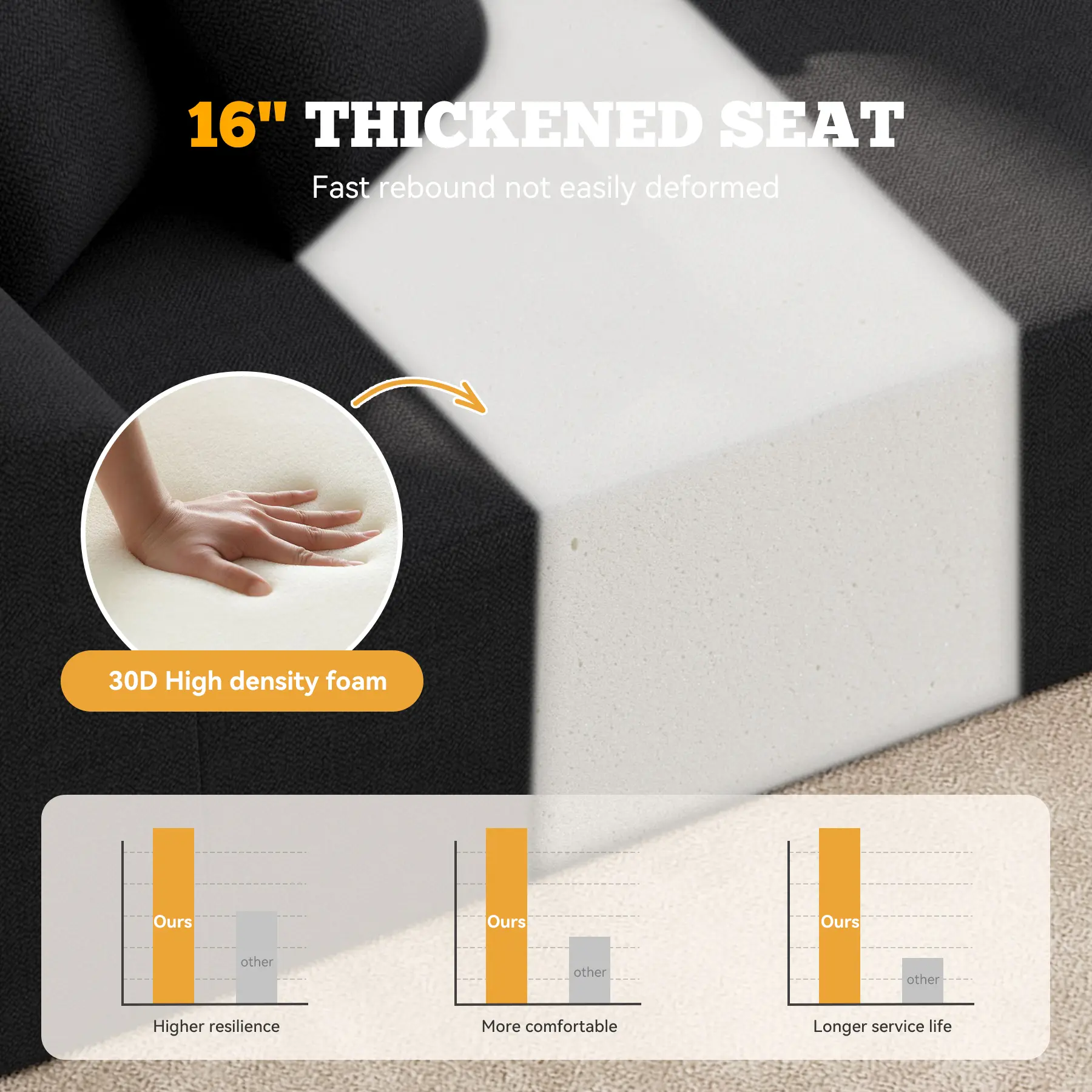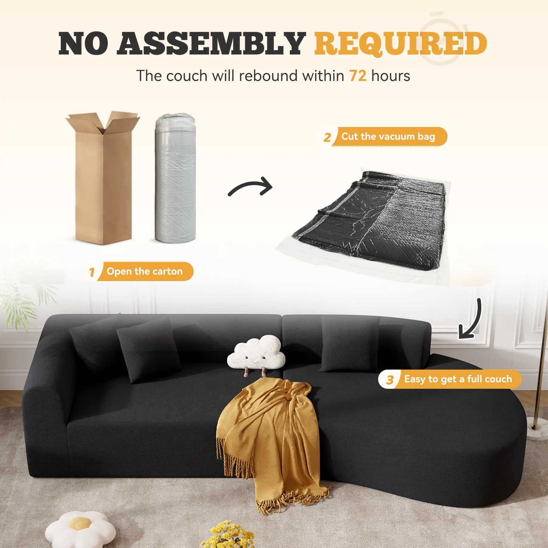 ·【No Assembly Required】 Say goodbye to furniture assembly nightmares with our modular cloud couch! Simply unpack, lightly pat the pieces, and allow the couch to regain its full shape within 72 hours. Perfect for large spaces, apartments, houses and anyone who needs a quick and easy furniture solution. Enjoy a hassle-free setup and the immediate comfort of your new sofa!