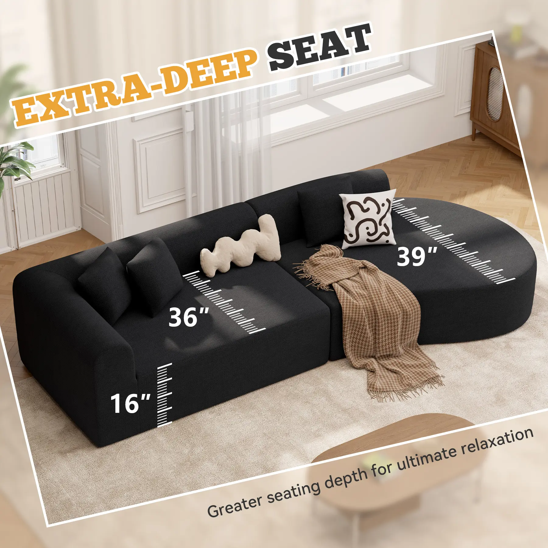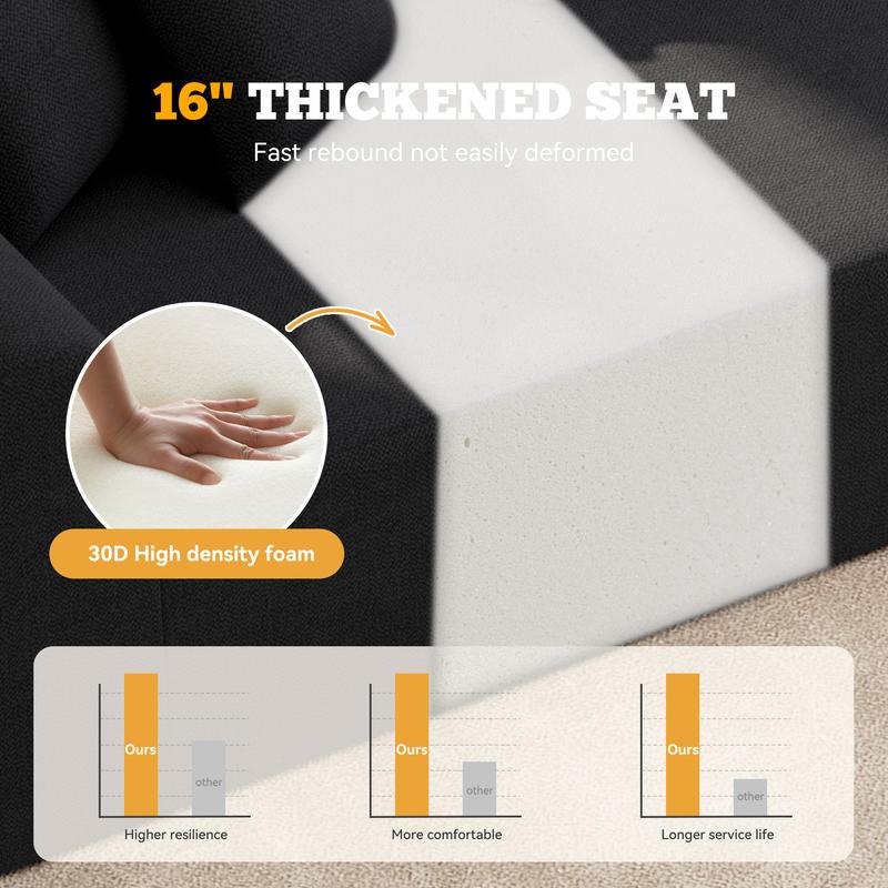 ·【Comfort Sectional Couch】 This oversized curved couch provides a truly cloud-like sitting experience with its high-resilience memory foam, wide armrest, and deeper seat that deliver excellent elasticity and support. It also comes with 3 extra pillows to add increased comfort when sitting for long periods or watching a movie. The anti slip design at the bottom ensures the stability of the sofa. Experience unparalleled comfort with our modular sectional sofa.