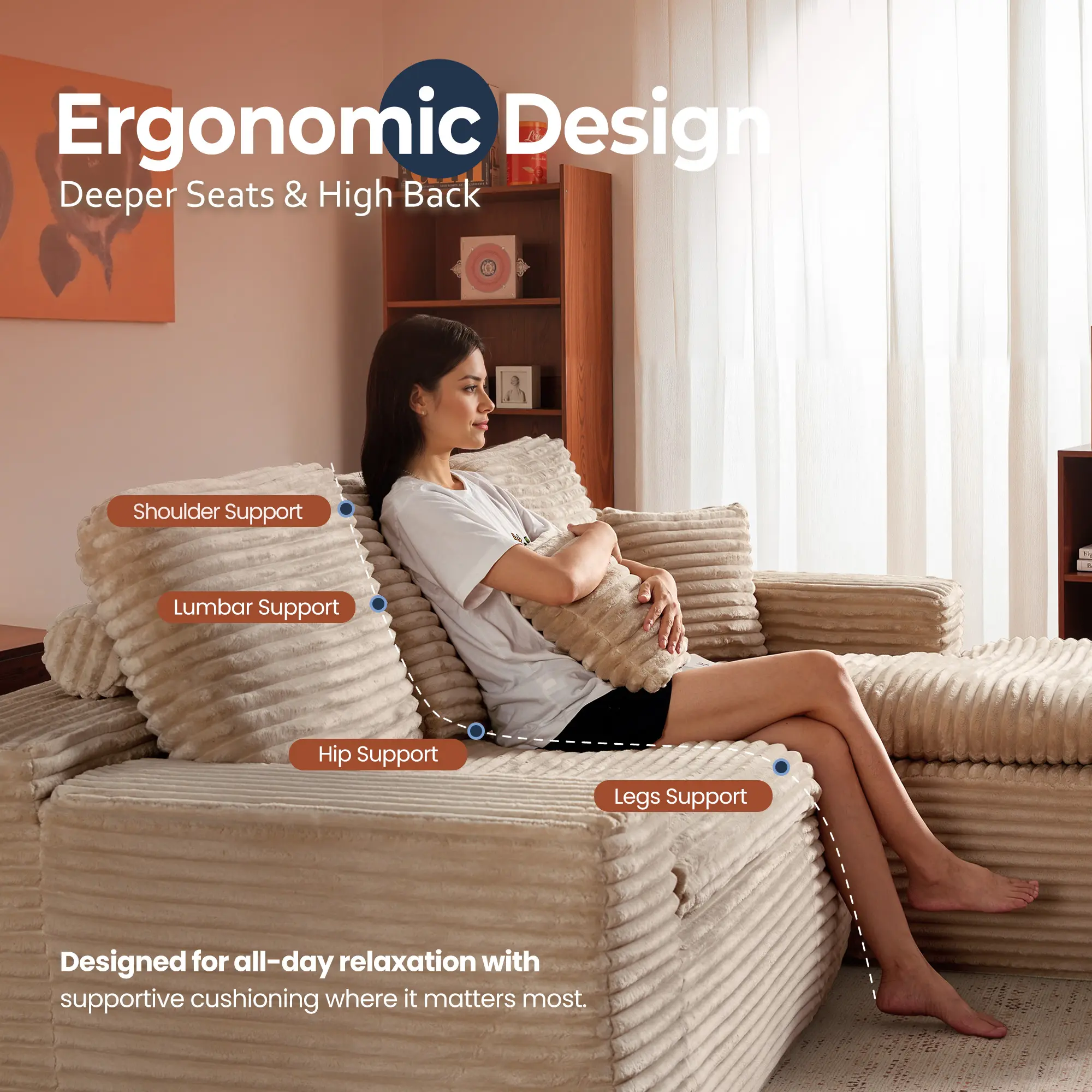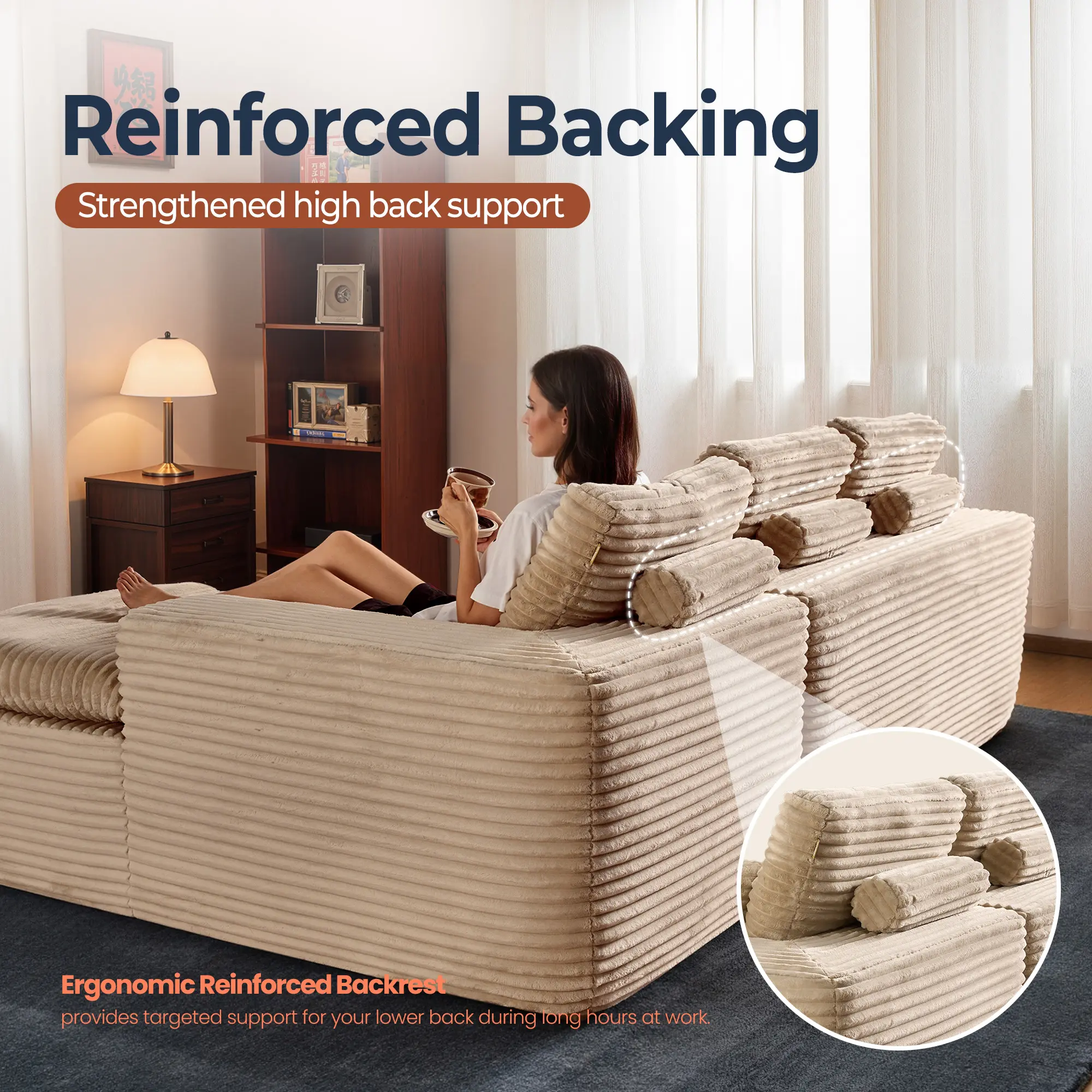 The modular L-shape design offers excellent support. Whether sitting upright, reclining, or lying down, this sofa ensures comfort. No assembly required; just unpack and gently pat to help the cushions expand.