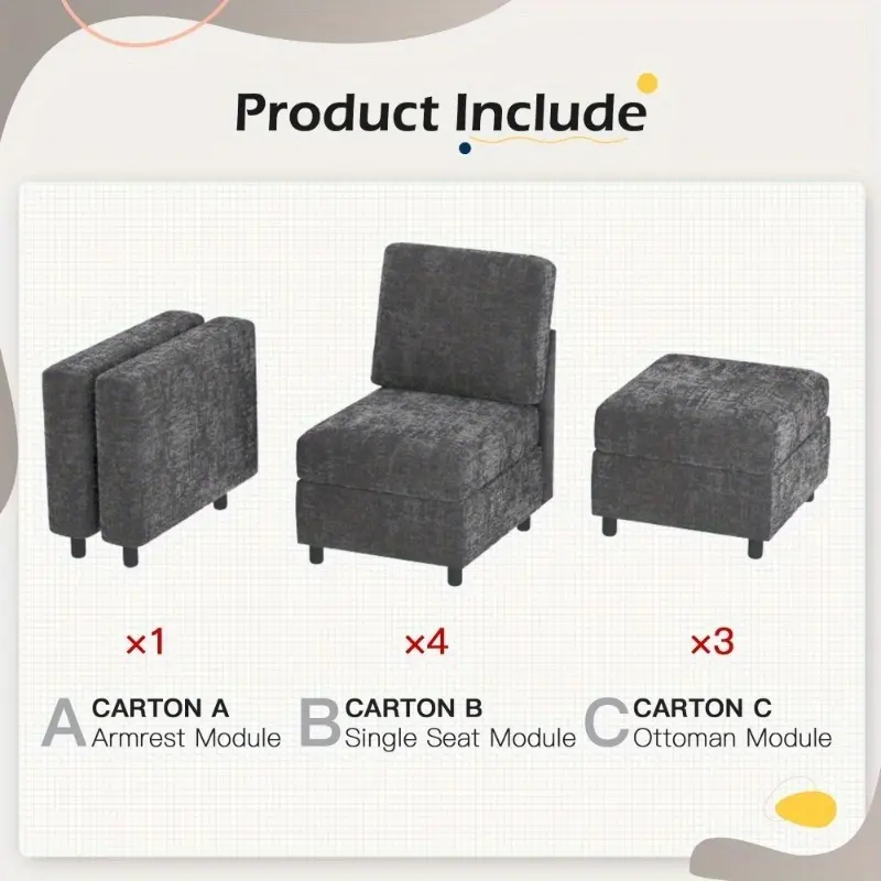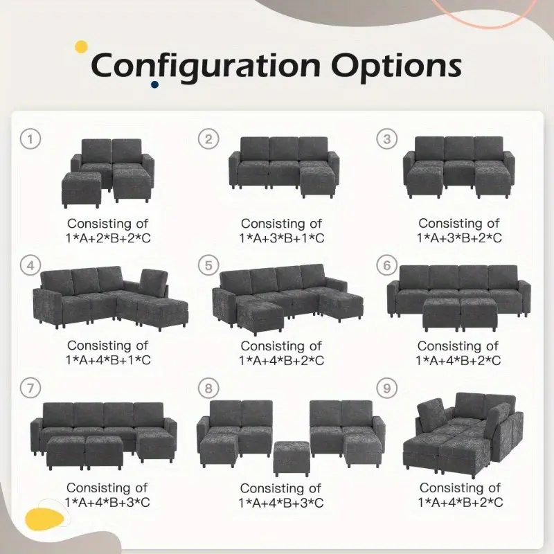 [Free Combination of Modular Sofa] Our modular sofas are divided into 3 main sections - single seat, ottoman and armrest, which can be easily adjusted and rearranged by yourself, such as the typical L-shape or U-shape sofas, as well as more creative arrangements. The 3 sections are individually movable and can be easily maneuvered through narrow corridors and doorways. When you move, the modular sectional sofa won't give you any trouble.