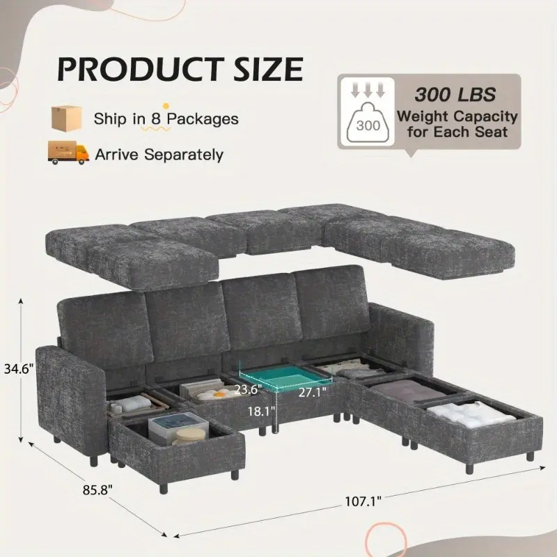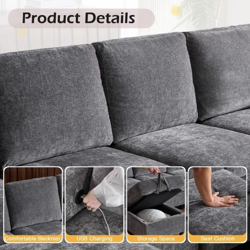 The charging port is attached to the armrest of the sofa, we have the UL certificate, you can play your phone or work on the sectional sofa without any burden, and the maximum load capacity of each sofa module is 300 pounds, very durable."